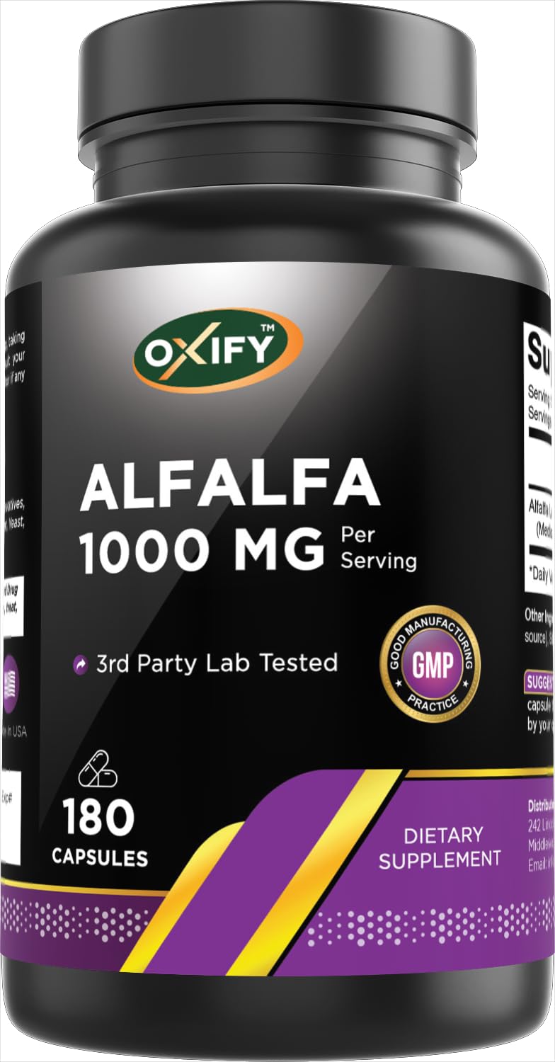 Oxify Alfalfa provides 1000 mg of alfalfa (Medicago sativa) per serving in easy-to-take capsules. Alfalfa is a traditional plant ingredient that has been used for generations in various wellness practices. This supplement is formulated to be gluten-free and non-GMO, and it's manufactured in the USA under strict quality standards. With 180 capsules per bottle, it offers a long-lasting supply for regular use.