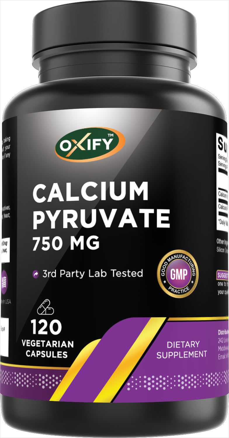 Oxify Calcium Pyruvate delivers 750 mg of calcium pyruvate per tablet in a 120-count bottle. This supplement is made without gluten or genetically modified ingredients and is produced in the USA under quality standards. It's intended for individuals adding calcium pyruvate to their daily supplement routine.