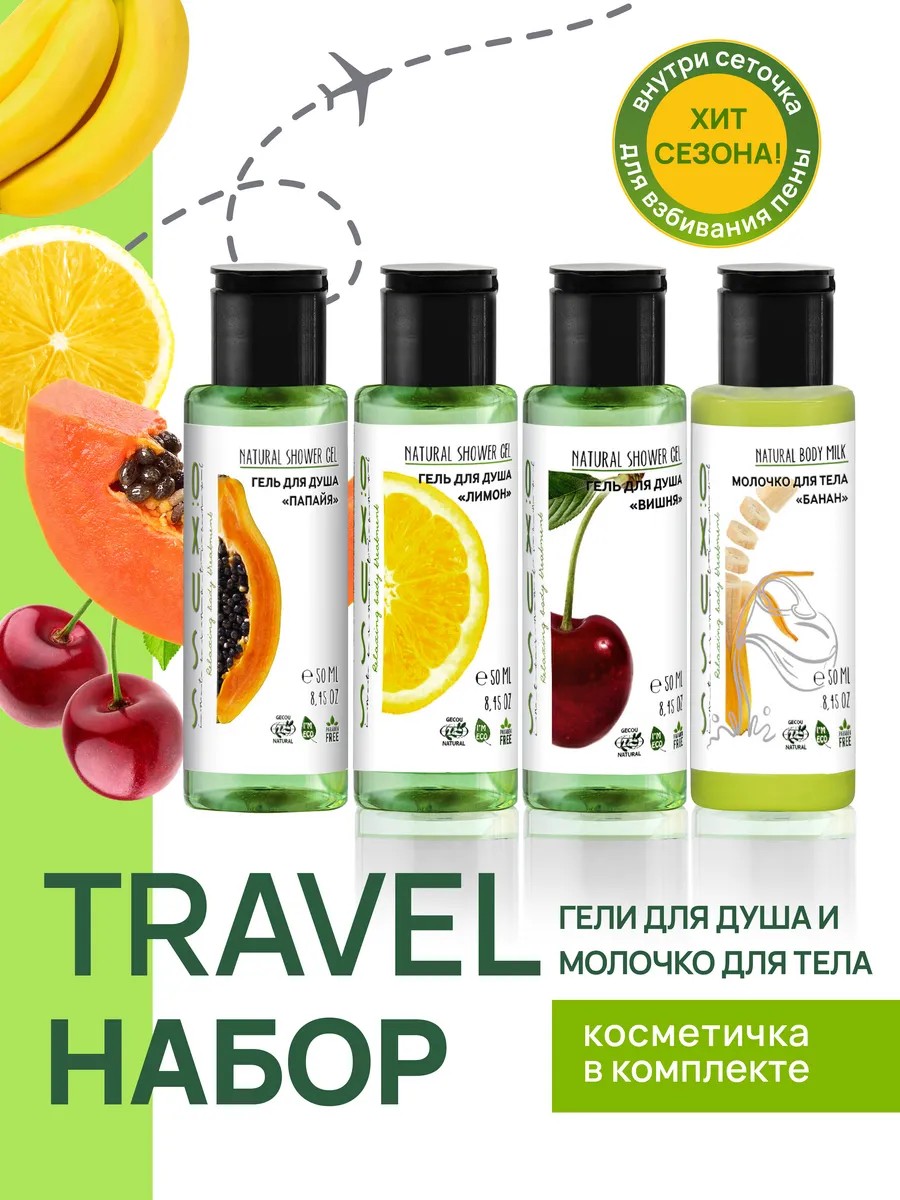 | Полное наименование товара | OXUSS Дорожный набор косметики в тревел формате с косметичкой 6 в 1 для путешественника: гель для душа Вишня 50мл, гель Лимон 50мл, гель Папайя 50мл, молочко Банан, сеточка-мочалка |