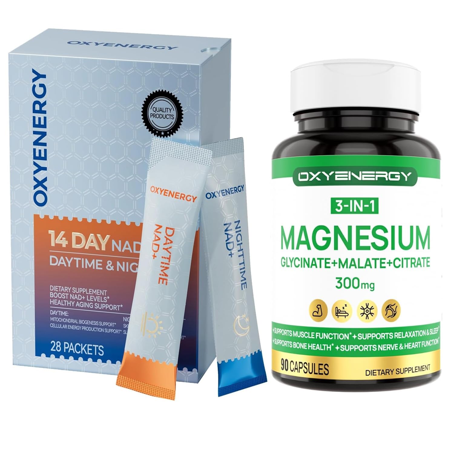 OxyEnergy NAD Supplement 1550 mg-Daytime Nicotinamide Riboside Nighttime L-Tryptophan with Resveratrol, Glutathione, PQQ, 24-Hour Nonstop Energy, Anti-Aging Cellular Renewal, 28 Packets OXYENERGY Triple Magnesium Complex Supplement, 3 in 1 Chelated Magnesium Capsules 300mg with Glycinate Malate Citrate per Servering, High Absorption, Bone, Heart Nerve Health, Vegan, 90 Capsules