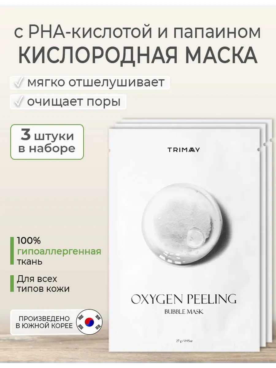 An oxygen peeling mask from the Korean brand Trimay, the Oxygen Peeling Bubble Mask, cleanses pores of impurities and sebum, gently exfoliates dead skin cells, accelerates regeneration, and absorbs excess sebum. The bubble mask moisturizes and nourishes the skin, helps smooth wrinkles and fine lines, and creates a more defined and toned facial contour, promoting beauty and health. This Korean cosmetic has a pronounced firming effect, strengthens skin tone, and improves skin elasticity. Suitable for young and mature skin, women's and men's, teenagers, and adults. The sheet is made of hypoallergenic 100% pure cotton, completely natural, soft to the touch, and very durable. The fabric perfectly retains serum and essence, preventing it from dripping. When interacting with the skin's warmth, bubbles are formed that penetrate deep into pores and cells, cleansing them of all types of impurities and delivering nourishing ingredients. The bubble mask adheres tightly to the skin, absorbs excess sebum, eliminates shine, and normalizes the pH balance. The bubble mask is rich in nutrients—vitamin C, minerals, and protein—that energize, heal, and add radiance to the skin. Niacinamide (Vitamin B3) brightens and effectively combats pigmentation, improves elasticity, and moisturizes. Gluconolactone, a polyhydroxy acid (PHA), stimulates cell renewal, smoothes wrinkles, lightens age spots, and reduces the severity of inflammation such as acne, dermatitis, rosacea, and psoriasis. Papain, a natural, gentle exfoliant, cleanses pores. It has a brightening effect, evens out skin tone, and improves complexion. It perfectly treats inflammation, copes with acne, blackheads, and breakouts. Create a gift set of Asian bath and shower cosmetics for your mom, sister, friend, or girlfriend as a holiday gift or just because. Volume: 27 ml. 3-piece pack. Original