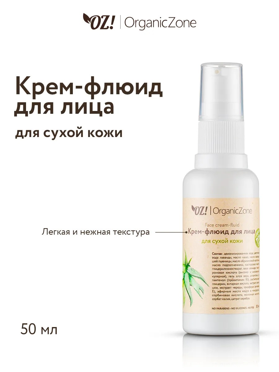 100% натуральный крем-флюид для сухой кожи лица интенсивно увлажняет и питает кожу. Борется с сухостью и шелушением. Делает кожу гладкой и шелковистой. Гиалуроновая кислота в составе флюида способствует удержанию влаги в коже, повышает ее эластичность. Гель алоэ вера увлажняет, освежает и успокаивает. Аллантоин стимулирует процессы восстановления, защищает чувствительную кожу. Масло зародышей пшеницы и какао способствуют устранению шелушений. Крем - флюид для сухой кожи лица OZ!OrganicZone обладает легкой и нежной текстурой, моментально впитывается. Идеально подходит в качестве основы под макияж.