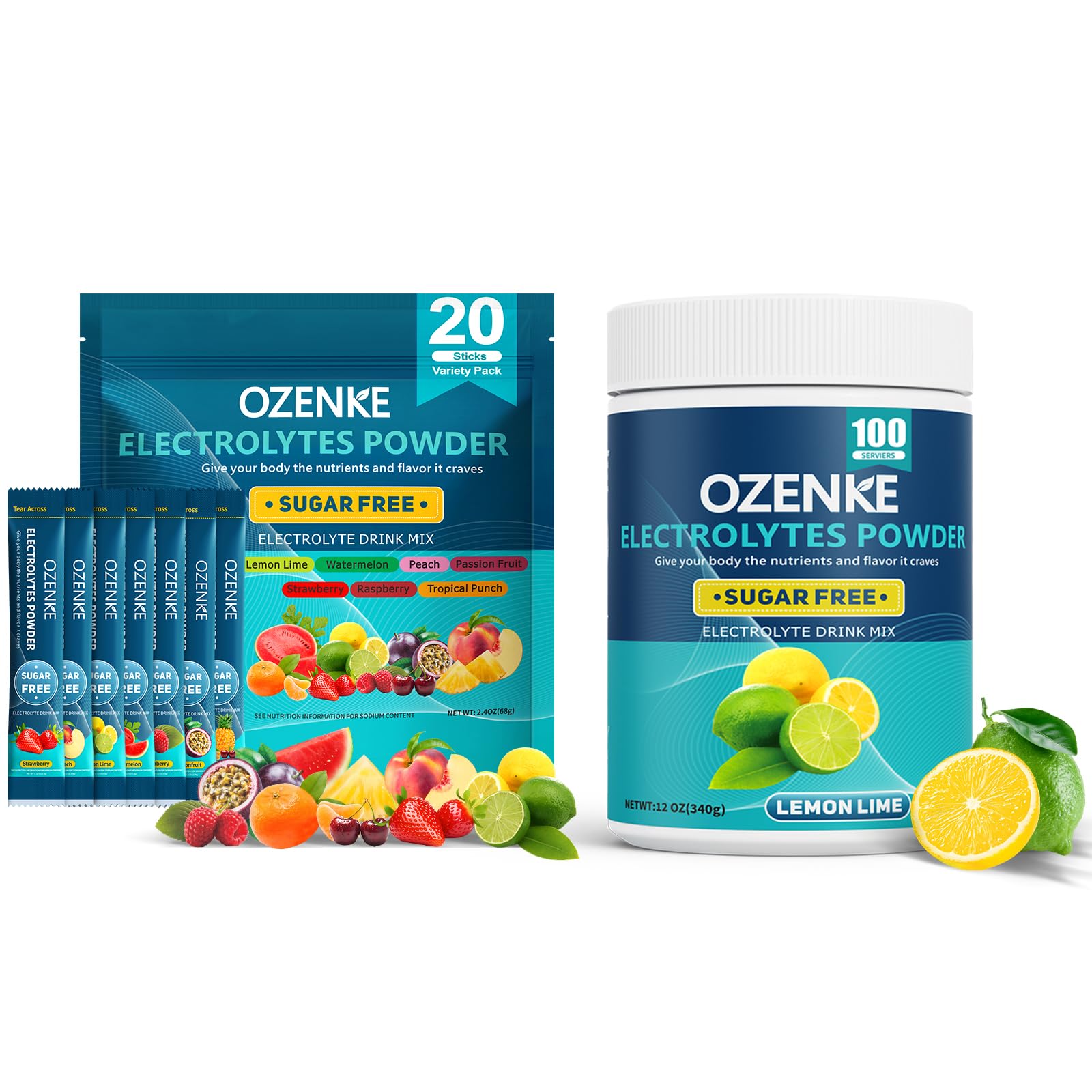 OZENKE Electrolytes Powder Packets, Hydration Packets, Electrolytes Powder No Sugar, Portable Electrolyte Drink Mix for Rapid Hydration, Sugar Free Low Sodium 0 Calorie 7 Flavors 20 Sticks Mix 1 stick pack with 16 oz of water to find your favorite taste, shake or stir until dissolved, ready to drink, iced is better taste. OZENKE Electrolytes Powder Sugar Free Hydration Powder, Electrolyte Powder No Sugar, Lemon Lime Flavor Electrolytes Drink Mix Supplement for Rapid Hydration, Low Sodium, 0 Calorie, 100 Servings Warm Tips: Please add water first, then pour in the electrolytes powder packets shake or stir for faster dissolve.How TO USE: Mix 1 stick pack or one level scoop with 16 oz of water to find your favorite taste, shake or stir until dissolved, ready to drink, iced is better taste. Warm Tips: Please add water first, then pour in the electrolytes powder packets shake or stir for faster dissolve! If you're not satisfied with our product, feel free to contact us anytime. We offer 24h service and can arrange for replacements or full refunds without the need for return. INDIVIDUALLY PACKAGED Refreshing Delicious:Delicious sugar free electrolytes powder lemon lime flavor, replenishes electrolytes like a Liquid Daily IV Hydrate for energy, endurance, immunity, workouts, travel, fasting, muscle function, relaxation, mood, daily activities. Portable hydration powder electrolyte packets are convenient to take, quick hydration whenever and wherever possible.It's the perfect addition to your travel essentials, cruise essentials, bachelorette party favors. STAY HYDRATED: Dehydration can negatively impact performance, health, and mood, causing fatigue, dizziness, headaches, brain confusion and more. Our sugar free hydration powder electrolyte mix contains Low Sodium, Calcium and VC, which can quickly hydrate the body and maintain fluid balance after exercise, travel. Get the hydration your body needs for optimal performance. QUICK HYDRATION: Our hydration powder have a professional formula that helps to replenish lost water and electrolytes in our body quickly. It's the perfect enhancing hydration solution energy booster for various dietary practices. It contains essential electrolytes like Sodium, Potassium ,Zinc, Vitamin, Magnesium and Calcium, which help maintain osmotic pressure of intracellular and extracellular fluids. PERFECT HYDRATION SET: OZENKE 20 sticks electrolytes sugar free, total 7 flavors, 3 sticks per 6 flavor including: lemon lime,watermelon,raspberry,strawberry,passion fruit,peach,2 sticks tropical punch flavors has tangy notes of tangerine,pineapple,cherry and OZENKE 100 servings electrolytes sugar free lemon lime flavor. Sugar free, gluten free and 0 Calorie, perfect for vegan and fasting. der for hydration and health, with pure natural organic fruits, Sodium,Calcium,Vitamin C,Potassium,Zinc.