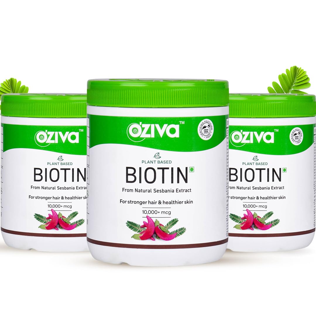 Suitable For Everyone Who Is 16 : Anyone between the age of 16 to 65, irrespective of gender, can consume OZiva Plant Based Biotin for hair growth. If you have an existing medical condition, we request you to consult your medical practitioner before taking the product. Har Tarah Se Better With Clean Plant-Based Products: OZiva Plant Based Biotin is a soy-free and gluten-free biotin for hair growth that contains no added sugar or artificial sweeteners, making it absolutely safe for long term consumption. It is 100 natural and is Certified Clean by the US CLP, tested and cleared for over 300 contaminants. It is also Certified Vegan by the Vegan Society of UK. Biotin that Revitalises Skin, Nails Body from Within: Aside from supporting better hair growth and texture, OZiva Biotin supports healthy skin and nails through ingredients like Pomegranate, which is a powerhouse of antioxidants for healthy skin. This biotin powder also works from the inside out to provide added benefits like stronger immunity, stamina, energy, metabolism, and healthy blood cells. Biotin Powder for Improved Hair Texture: Plant-based ingredients in OZiva Biotin like Silica from the natural bamboo shoot are key co-nutrients for making your hair shinier. OZiva Plant Based Biotin contains plenty of phyto actives for hair care that work their way throughout your hair to help improve hair texture. Plant-Based Biotin for Hair Growth: OZiva Plant Based Biotin contains 10000 mcg of 100 natural Biotin derived from Sesbania Agati extracts. The proprietary blend of SesZenBio helps stimulate hair follicles up to 2 times to support hair growth and strengthen hair for longer and healthier hair from the inside-out.