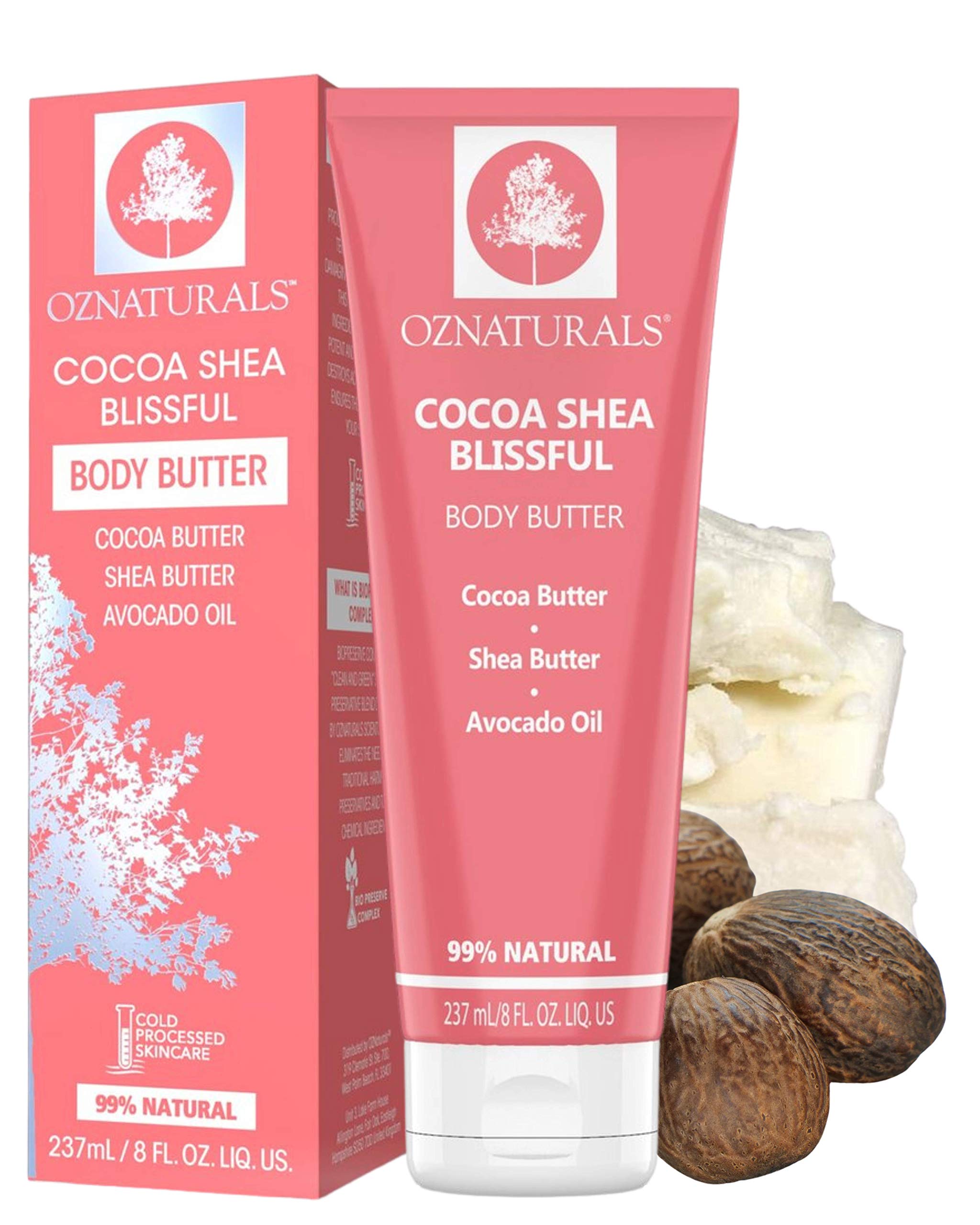? HEALTHY AND EFFICIENT, COLD-PROCESSED ASSET-BASED PRODUCTS: All OZNaturals products are formulated without the addition of heat. ? DEEPLY HYDRATES: For healthy, radiant skin, this moisturizing body lotion with cocoa and shea butter treats dry, rough, and chapped skin. ? A SMOOTHIE FOR YOUR SKIN: This body lotion infused with cocoa and shea butter helps repair skin and protect it from severe dryness. ? HELPS REDUCE BLENDS AND STRETCHING MARKS: This all-natural body butter penetrates deep into the skin and locks in moisture for consistently healthy-looking skin. ? BOOSTS YOUR SKIN: Super nourishing and moisturizing, OZNaturals Cocoa and Shea Body Butter is packed with vitamins that promote healthy, radiant skin.
