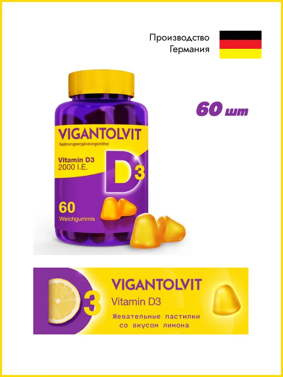Жевательные витаминные пастилки VIGANTOLVIT D3 2000 МЕ — это вкусный и удобный способ поддержать уровень витамина D в организме. Содержат 2000 международных единиц (50 мкг) витамина D3 в каждой пастилке. Приятный лимонный вкус. Без необходимости глотать капсулы или таблетки.