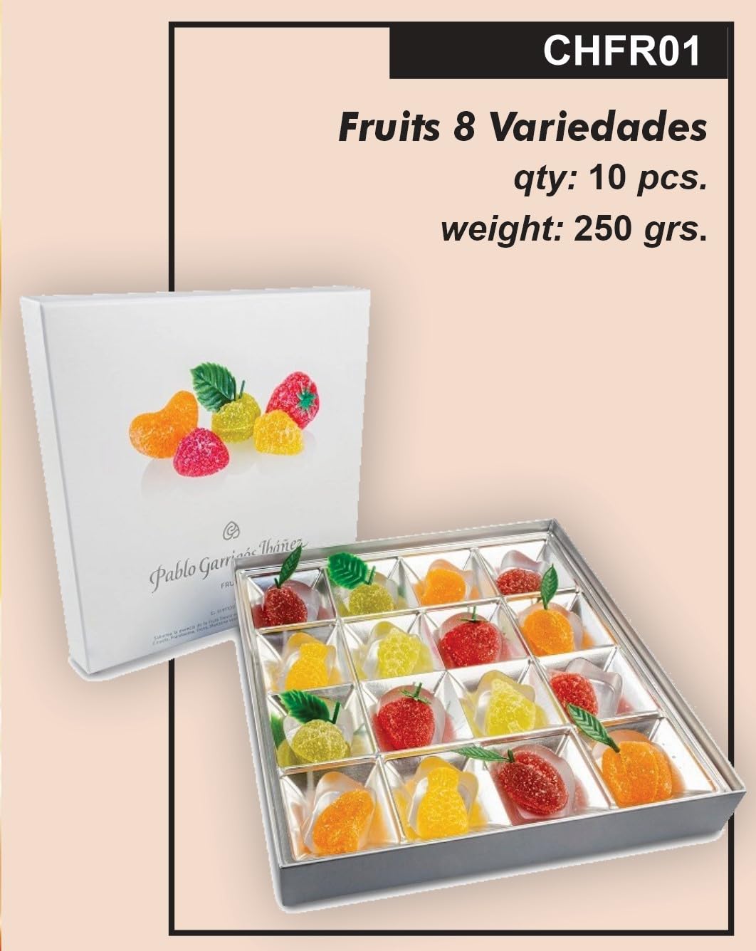 The renowned candies and turrón brand "Pablo Garrigós" surprises with these "fruits," a blend of sweets and healthy fruits, allowing you to enjoy each of the eight different fruit varieties: plum, raspberry, strawberry, green apple, peach, mandarin, pineapple, and grape. In each one, you'll be surprised by the delicious taste of the pulp from which they are made, with a minimum fruit content of 35 . Without a doubt, they will delight all the senses, because once you open the box, you'll be amazed by the exquisite and meticulous presentation, which resembles tiny fruit pearls. INGREDIENTS Sugar, pulp (min. 35 ), glucose syrup, water, gelling agent (pectin), acid (citric acid), flavorings (strawberry, grape, mandarin, raspberry, apricot, plum, pineapple and apple) and colors (E-101, E-120, E-141, E-161b, E-162 and HibGourmet Gomme aux fruits 250 gDESCRIPTION DU PRODUIT DESCRIPTION DU PRODUIT La célèbre signature des bonbons et de Turrón « Pablo Garrigós » surprend par ces « fruits », une humeur entre les bonbons et les fruits sains, et vous permet de profiter de chacune des huit variétés de fruits différentes, vous avez été fabriqué en prune, framboise, fraise, pomme verte, pêche, mandarine, ananas et raisin. Et dans chacun d'entre eux, vous serez surpris par le délicieux goût de la pulpe avec laquelle elles sont fabriquées, avec une teneur minimale de 35 . Sans aucun doute, ils feront plaisir à tous les sens, car une fois que vous ouvrez la boîte, vous serez surpris par la présentation exquise et méticuleuse que vous ressentez comme de petites perles de fruit. INGRÉDIENTS Sucre, pulpe (min. 35 ), sirop de glucose, eau, agent gélifiant (Pectin), acidifiant (acide citrique), arômes (fraise, raisin, mandarine, framboise, abricot, prune, ananas et pomme) et colorants (E-101, E-120, E-141, E-161b, E-162 et Hib