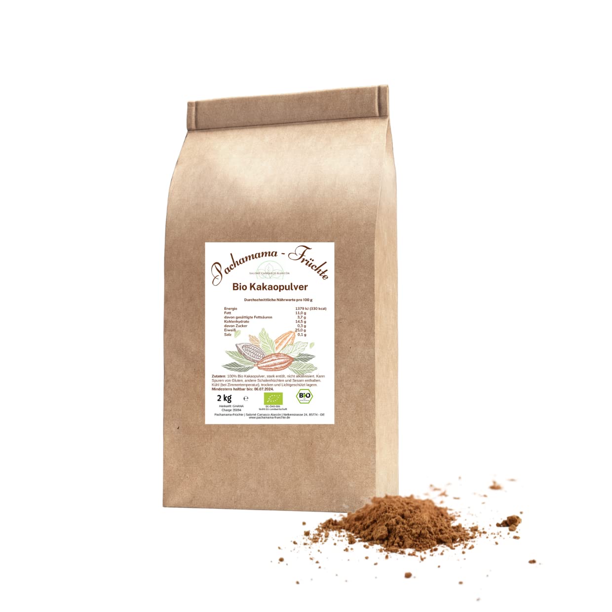 Organic, highly defatted cocoa powder. Our organic cocoa powder is made from 100 natural cocoa beans. Highly defatted cocoa powder (fat content: 11 ) is a pure, natural product and therefore free of any additives. Our raw, high-quality cocoa powder has an intense cocoa flavor with a slightly tangy note. Our cocoa powder has not been alkalized to keep our product natural and free of chemicals. Cocoa naturally contains a very high percentage of antioxidants. These help the body protect itself against free radicals. In addition, minerals such as magnesium, phosphorus, potassium, iron, and zinc are also present in higher quantities in pure cocoa powder. The alkalization process significantly reduces the proportion of these substances, thus also diminishing their beneficial effects. Just try it. Uses: Cocoa powder is versatile. Whether for preparing hot chocolate or for making chocolates, desserts, cakes, and other treats, our organic cocoa powder makes everything an unforgettable taste experience. Contents: 2 kg. Our cocoa powder meets the requirements for organic certification and is also certified organic (DE-ÖKO-006). Features: No additives (artificial flavors, colors, added sugars, preservatives, flavorings), non-GMO. Manufacturer's Address: Salomé Carrasco Alarcón, Oeillets 24, D-85774 Support Ring www.pachamama-fruechte.de INSTRUCTIONS: To prepare hot chocolate, add 2 to 3 tablespoons of cocoa powder to a cup of hot milk. Stir well until the powder is completely dissolved. For desserts and other recipes, you can add cocoa powder according to the recipe's requirements. SAFETY WARNING Not suitable for children under 3 years old. Dilute well before consuming. See morePoudre de cacao bio - 2 kg - Très dégraissée - Sans additifs - Sans sucre - Sans plastique - Superfood végétalienDESCRIPTION DU PRODUIT DESCRIPTION DU PRODUIT Poudre de cacao bio fortement dégraissée. Notre poudre de cacao bio est fabriquée à partir de fèves de cacao 100 naturelles. La poudre de cacao fortement dégraissée (teneur en matières grasses : 11 ) est un produit naturel pur et donc sans aucun additif. Notre poudre de cacao de qualité crue a un goût de cacao intense avec une note légèrement acidulée. Notre poudre de cacao n'a pas été alcalinisée pour garder notre produit naturel et exempt de produits chimiques. Le cacao contient naturellement un très haut pourcentage d'antioxydants. Ceux-ci aident le corps à se protéger contre les radicaux libres. En outre, des minéraux tels que le magnésium, le phosphore, le potassium, le fer et le zinc sont également présents en plus grande quantité dans la poudre de cacao pure. Grâce au processus d'alcalinisation, la proportion de ces substances est énormément réduite et donc également l'effet bénéfique pour la santé. Essayez simplement. Utilisation : La poudre de cacao est variée, que ce soit pour la préparation d'un cacao chaud ou pour la fabrication de chocolat, desserts, gâteaux et autres friandises, notre poudre de cacao bio fait de tout une expérience gustative inoubliable. Contenu : 2 kg. Notre poudre de cacao répond aux exigences de certification bio et est également certifiée bio (DE-ÖKO-006). Caractéristiques : Sans additifs (arômes artificiels, colorants, sucres ajoutés, conservateurs, arômes), sans OGM. Adresse du fabricant. Salomé Carrasco Alarcón, Oeillets 24, D-85774 Bague de support www.pachamama-fruechte.de MODE D'EMPLOI Pour préparer un chocolat chaud, ajoutez 2 à 3 cuillères de poudre de cacao à une tasse de lait chaud. Remuez bien jusqu'à ce que la poudre soit complètement dissoute. Pour les desserts et autres recettes, vous pouvez ajouter la poudre de cacao selon les exigences de la recette. AVERTISSEMENT DE SÉCURITÉ Ne convient pas aux enfants de moins de 3 ans. Bien diluer avant consommation. Voir plus