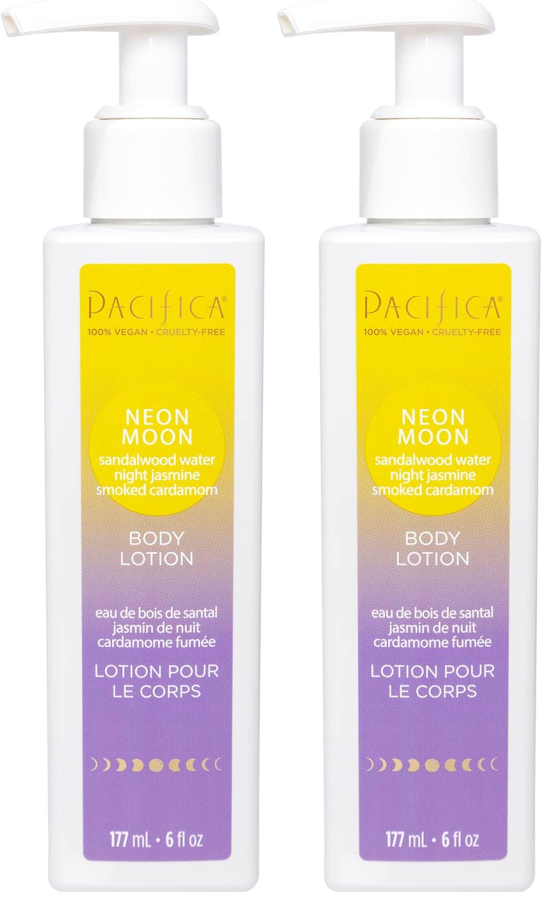 This lightweight, super hydrating body lotion combines an alluring scent blend of sandalwood, jasmine and smoky cardamom with nourishing sunflower, avocado oils and shea butter to support your dreamiest skin.LIGHTWEIGHT FAST-ABSORBING – Enjoy all the benefits of a rich body cream with none of the heaviness. This lotion absorbs into your skin in seconds with a non-greasy finish, letting you dress immediately after applying – no waiting around or sticky feel. Its light texture and buildable scent make it perfect for everyday use, morning or night. Smooth it on post-shower for an instant boost of hydration and fragrance, or apply before bed to nourish your skin overnight. Either way, you'll wake up or head out with skin that feels soft, hydrated and comfortable, never slick or oily. CLEAN VEGAN FORMULA – Neon Moon Body Lotion is 100 vegan and cruelty-free, reflecting Pacifica's commitment to compassion. Our formula is free of harsh chemicals like parabens, phthalates, SLS, and mineral oil (no silicones either), so you can nourish your skin without worry. It's gentle and non-irritating – suitable for all skin types. Plus, we package this lotion in a bottle made from 100 post-consumer recycled plastic, helping reduce waste. Indulge in self-care that's safe for your skin and kinder to the planet with this clean, green beauty staple. DEEP HYDRATION, NO GREESS – Despite its lush hydration, this body lotion feels feather-light on your skin. The formula provides long-lasting moisture to quench dry, rough skin all over without any greasy residue. It absorbs quickly and penetrates deeply, helping to heal flaky patches and leave skin velvety-soft and supple. Use it daily to transform dehydrated, dull skin into healthy, glowing skin that stays moisturized for hours. You'll love that it delivers intense hydration and skin-smoothing benefits with a weightless, clean finish. SKIN-LOVING INGREDIENTS – Feed your skin with a nourishing cocktail of plant-based goodness. This lotion is enriched with avocado oil sunflower oil, packed with vitamins fatty acids to help strengthen and soften your skin. We've also added shea butter – a rich natural moisturizer that melts in to relieve dryness lock in hydration. These skin-loving ingredients work together to support your skin's barrier and impart a silky-smooth texture. Your body will feel pampered as the lotion delivers vital nutrients moisture deep into your skin, helping it stay healthy cared for after every use. ALLURING SANDALWOOD JASMINE SCENT – Immerse yourself in the mysterious aura of Pacifica's Neon Moon fragrance. Inspired by a moonlit night in Ibiza, this gender-neutral scent is an intoxicating blend of smoky sandalwood, delicate jasmine, a hint of spicy cardamom. The result is a sultry, enigmatic aroma that evokes a sense of adventure fluidity – it's both earthy and floral, appealing to everyone. As you apply this lotion, the captivating scent unfolds on your skin, creating a subtle fragrance that delights the senses without being overpowering. Its unisex appeal, making it loved by all. The information below is per-pack only.