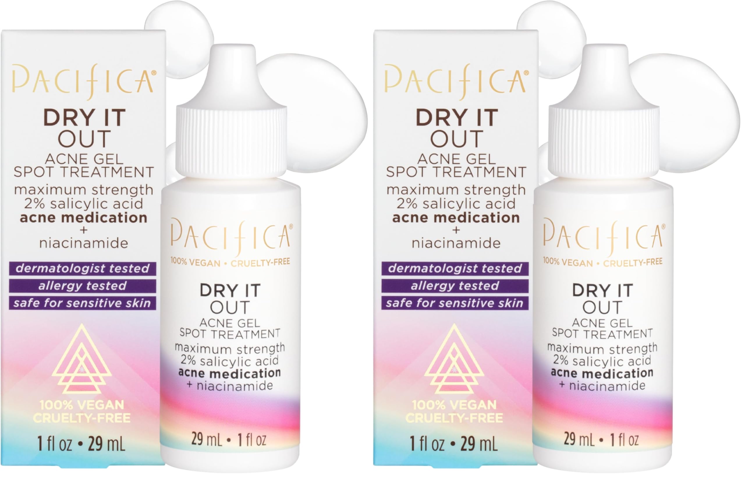 This witch hazel and maximum strength salicylic acid come together in this effective spot treatment designed to dry out blemishes on the spot. Its ingredients include sage, cucumber, mint and niacinamide. It is for acne prone and oily skin.FREE OF HARSH CHEMICALS CLEAN, VEGAN CRUELTY-FREE FORMULA – Fight acne without compromising your values. Pacifica's Dry It Out spot treatment is 100 vegan and cruelty-free, made with skin-loving ingredients and none of the harsh chemicals (no parabens, phthalates, sulfates or stripping alcohols). Formulated without synthetic fragrances or dyes, this clean acne gel is a conscientious choice for clear skin. Maintain your clean beauty lifestyle while effectively banishing blemishes. FOR OILY, ACNE-PRONE COMBINATION SKIN – Developed especially for breakout-prone oily skin, this spot treatment is tough on pimples yet gentle on your skin. The non-irritating gel is oil-free and won't clog pores, making it suitable even for combination or sensitive skin that needs acne care. Whether you're a teen dealing with hormonal breakouts or an adult combating occasional stress acne, this targeted treatment helps keep your complexion clear and balanced. FAST-ACTING OVERNIGHT RESULTS – Apply a thin layer of this fast-drying acne gel at the first sign of a blemish and let the powerful actives work their magic. The quick-absorbing formula dries clear, making it suitable for daytime under makeup or as an invisible overnight treatment. It rapidly diminishes pimple size, swelling and redness while you sleep, so you can wake up to a visibly clearer, smoother complexion. PURIFYING BOTANICALS NIACINAMIDE – Infused with witch hazel, sage, cucumber, and mint extracts, our targeted acne spot cream helps purify skin, tighten pores, and calm inflammation naturally. Niacinamide (vitamin B3) supports a healthy complexion by balancing oil, fading the look of acne scars and dark spots, and soothing irritation. This multi-ingredient formula treats acne without over-drying surrounding skin. MAXIMUM STRENGTH ACNE FIGHTER – Formulated with 2 salicylic acid (the highest level allowed in an acne treatment), this spot gel starts clearing pimples and blemishes on contact. It penetrates pores to dissolve oil and debris, helping shrink angry zits overnight and reduce redness for clearer skin by morning. Ideal for emergency breakout control to stop blemishes in their tracks fast. The information below is per-pack only.