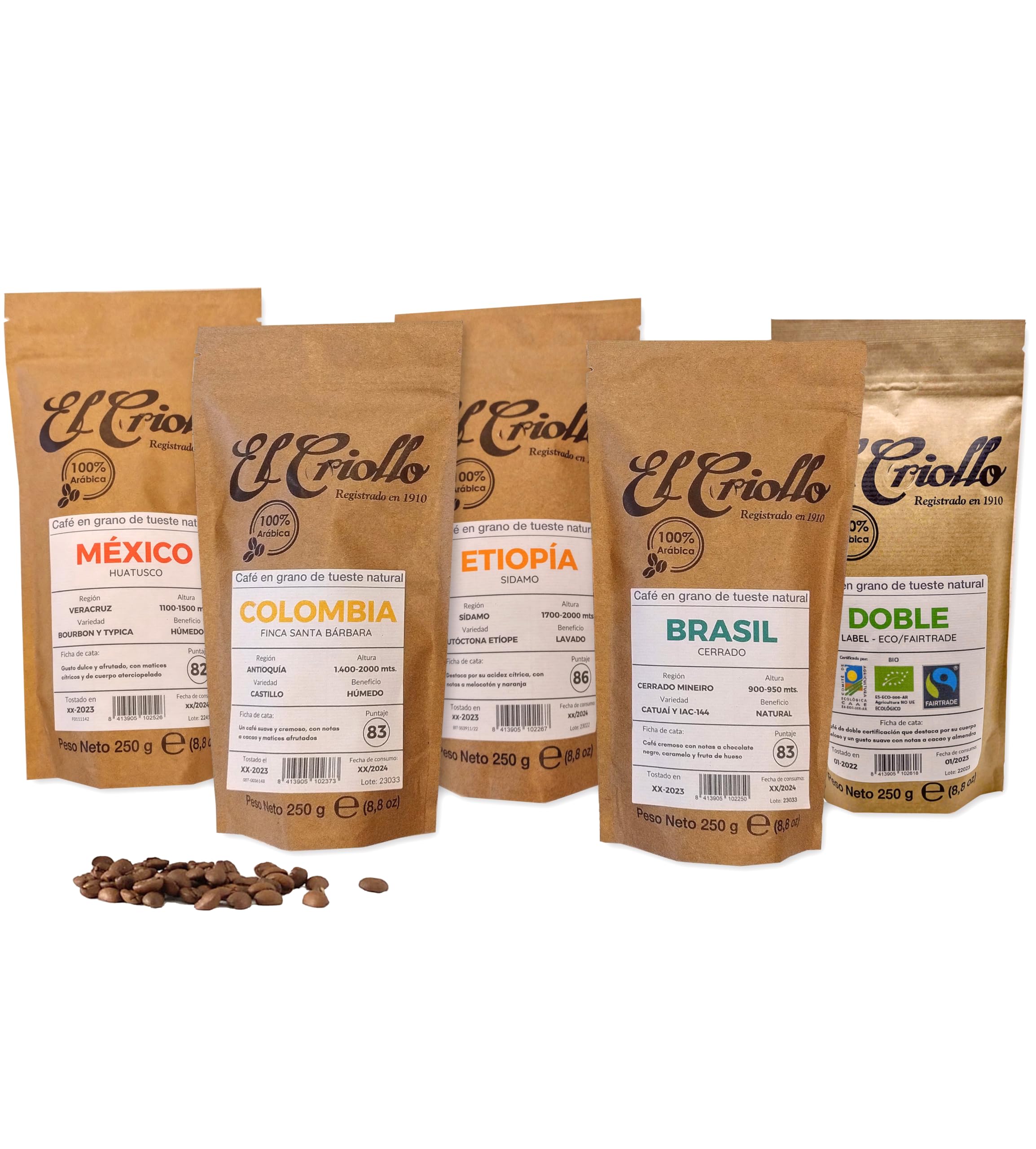 Pack dégustation de grains de café de spécialité - Cafés El Criollo Éthiopie, Colombie, Mexique, Brésil et Double Label Café Gourmand 100 Arabica et torréfaction naturelle Paquet de 5x250g