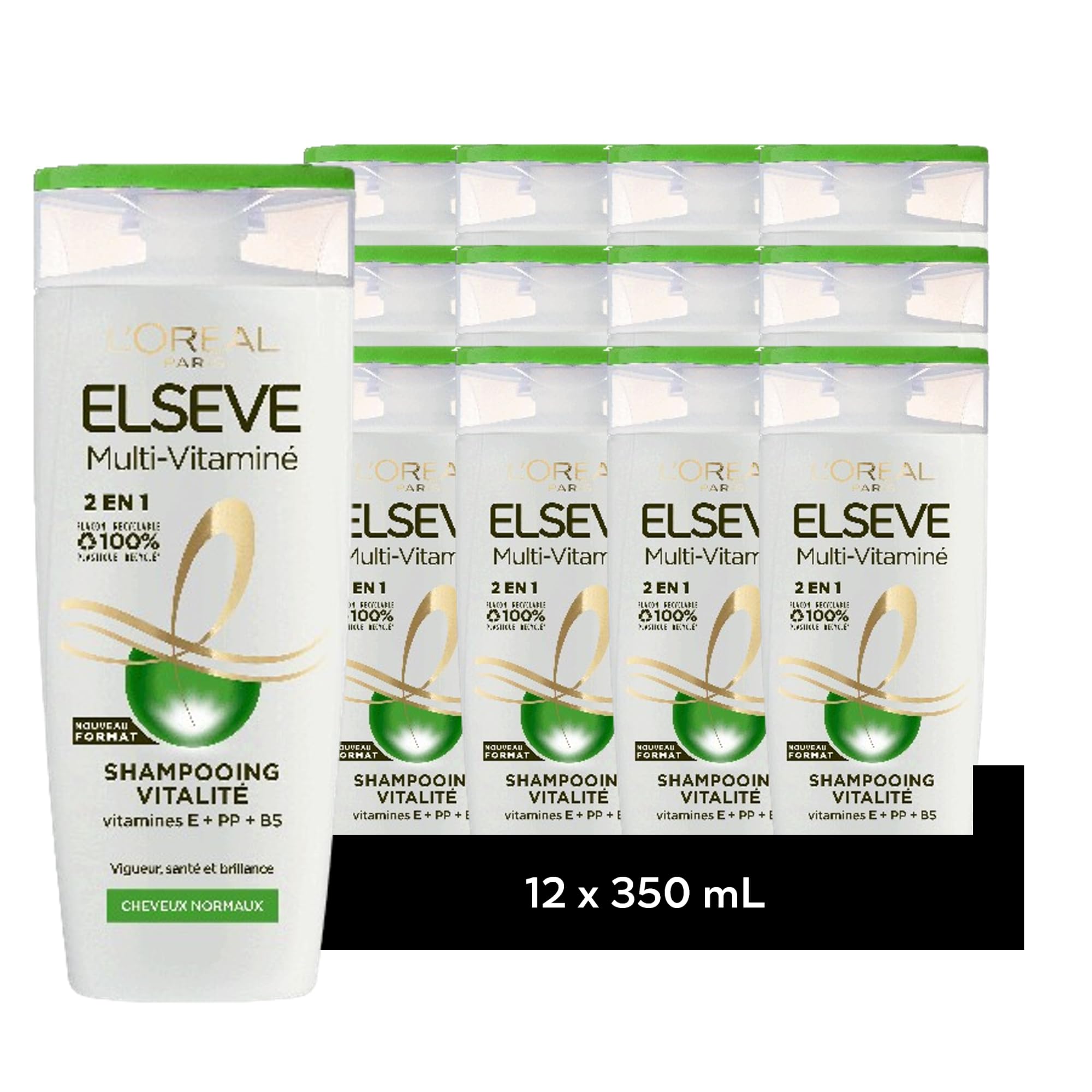 Hair lacking vitality? The 2 in 1 Multi-Vitamin Revitalizing Shampoo, enriched with vitamins E PP B5 , revives and takes care of tired hair lacking shine: - Nourished and strengthened lengths - Hair radiant with vitality Elseve is committed to a more sustainable world: - This bottle is made 100 with recycled plastic - This bottle is 100 recyclable - Think about sorting! - Produced in France derived from vitamin E, provitamins B5. excluding colorings and cap INGREDIENTS 1165932 C - INGREDIENTS: AQUA WATER • SODIUM LAURETH SULFATE • DIMETHICONE • COCO-BETAINE • SODIUM CHLORIDE • GLYCOL DISTEARATE • NIACINAMIDE • GUAR HYDROXYPROPYLTRIMONIUM CHLORIDE • TOCOPHERYL ACETATE • SODIUM BENZOATE • SODIUM HYDROXIDE • PPG-5-CETETH-20 • MAGNESIUM GLUCONATE • SALICYLIC ACID • LIMONENE • FUMARIC ACID • PANTHENOL • BENZYL BENZOATE • LINALOOL • BENZYL ALCOHOL • BENZYL SALICYLATE • CARBOMER • CITRONELLOL • CITRIC ACID • HEXYL CINNAMAL • PARFUM FRAGRANCE (F.I.L. C205853 1). The lists of ingredients used in the composition of our brand's products are regularly updated. Before using a product from our brand, you are invited to read the list of ingredients on its packaging to ensure that the ingredients are suitable for your personal use. SAFETY WARNING In case of contact with eyes, rinse immediately and thoroughly. Apply to wet hair, massage thoroughly over the entire scalp to activate microcirculation, then rinse. Remember to turn off the water in the shower. Apply to wet hair, massage thoroughly over the entire scalp to activate microcirculation, then rinse. Remember to turn off the water in the shower.,Vigorous, shiny, and healthy hair. Revives and cares for tired hair thanks to its formula enriched with vitamins E PP B5. 2-in-1 Revitalizing Shampoo for Normal Hair enriched with vitamins E PP B5 100 recycled and recyclable plastic bottle Made in France excluding dyes and cap. Cheveux en manque de vitalité? Le Shampoing Revitalisant Multi-Vitaminé 2 en 1, enrichi en vitamines E PP B5 , ravive et prend soin des cheveux fâtigués en manque d'éclat : - Longueurs nourries et renforcées - Cheveux éclatants de vitalité Elseve s'engage pour un monde plus durable: - Ce flacon est fabriqué à 100 avec du plastique recyclé - Ce flacon est 100 recyclable - Pensez au tri ! - Produit en France dérivé de la vitamine E, provitamines B5. hors colorants et bouchon INGRÉDIENTS 1165932 C - INGREDIENTS: AQUA WATER • SODIUM LAURETH SULFATE • DIMETHICONE • COCO-BETAINE • SODIUM CHLORIDE • GLYCOL DISTEARATE • NIACINAMIDE • GUAR HYDROXYPROPYLTRIMONIUM CHLORIDE • TOCOPHERYL ACETATE • SODIUM BENZOATE • SODIUM HYDROXIDE • PPG-5-CETETH-20 • MAGNESIUM GLUCONATE • SALICYLIC ACID • LIMONENE • FUMARIC ACID • PANTHENOL • BENZYL BENZOATE • LINALOOL • BENZYL ALCOHOL • BENZYL SALICYLATE • CARBOMER • CITRONELLOL • CITRIC ACID • HEXYL CINNAMAL • PARFUM FRAGRANCE (F.I.L. C205853 1). Les listes d'ingrédients entrant dans la composition des produits de notre marque sont régulièrement mises à jour. Avant d'utiliser un produit de notre marque, vous êtes invités à lire la liste d'ingrédients figurant sur son emballage afin de vous assurer que les ingrédients sont adaptés à votre utilisation personnelle AVERTISSEMENT DE SÛRETÉ En cas de contact avec les yeux, rincez immédiatement et abondamment. Appliquez sur cheveux mouillés, massez soigneusement sur l'ensemble du cuir chevelu pour activer la micro-circulation puis rincez. Pensez à couper l'eau sous la douche. Appliquez sur cheveux mouillés, massez soigneusement sur l'ensemble du cuir chevelu pour activer la micro-circulation puis rincez. Pensez à couper l'eau sous la douche.,Des cheveux vigoureux, brillants et pleins de santé. Ravive et prend soin des cheveux fâtigués grâce à sa formule enrichie en vitamines E PP B5. Shampoing Revitalisant 2 en 1 pour Cheveux Normaux enrichi en vitamines E PP B5 Flacon en plastique 100 recyclé et recyclable Fabriqué en France hors colorants et bouchon.