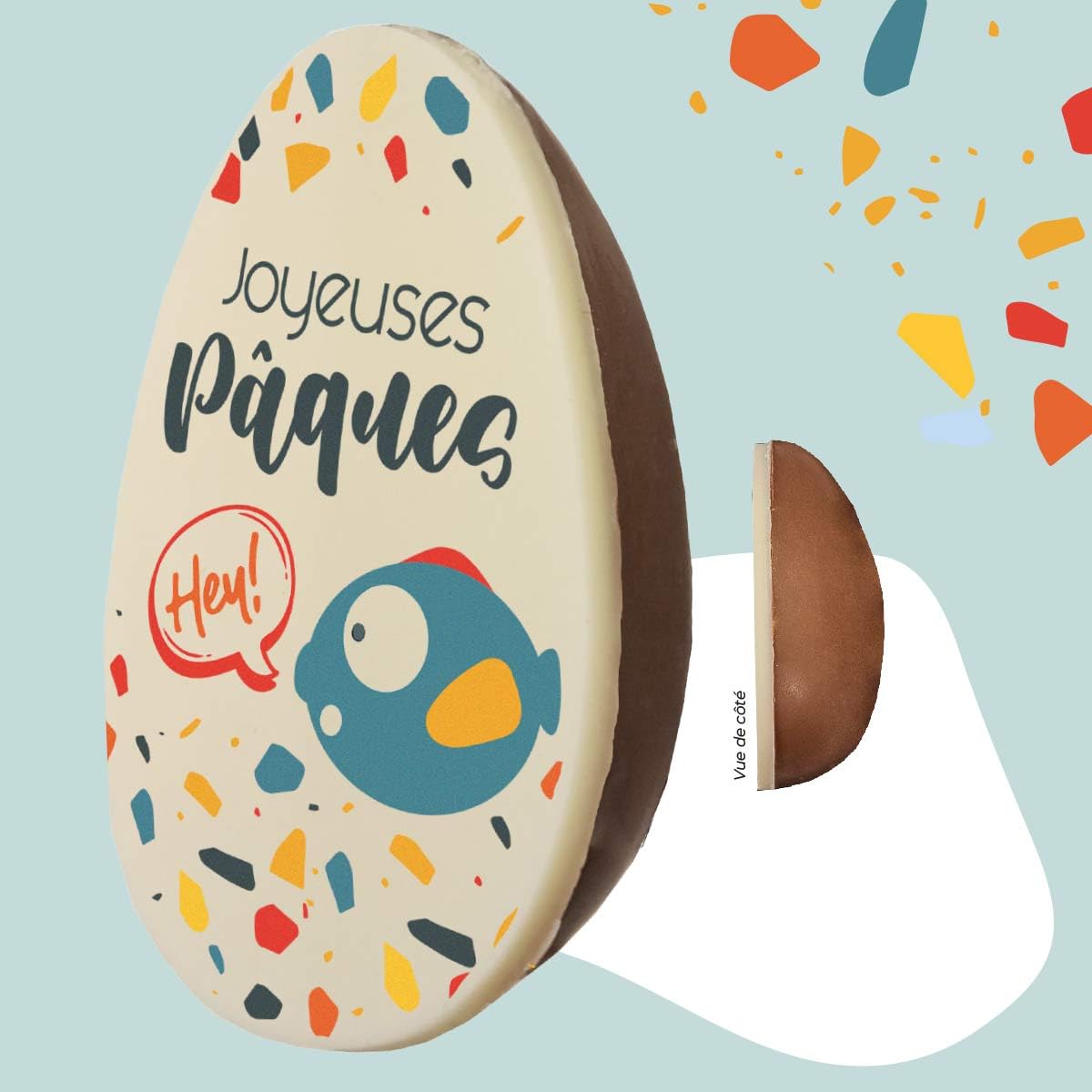 Chocodic Master artisan chocolatier for 20 years. Handcrafted in our chocolatier in Vendée, La Roche-sur-Yon. Ready to offer in a crystal bag. Set of 2 items - Small model 50g - 11x6cm. Chocolate half egg on a personalized "Happy Easter" base - Customization according to production.Chocodic Maître artisan chocolatier depuis 20 ans. Fabriqué de facon artisanale dans notre chocolatier en vendée à la Roche sur Yon. Prêt à offrir sous sachet cristal. lot de 2 sujet - Petit modèle 50g - 11x6cm. Demi oeuf en chocolat sur socle personnalisé "Joyeuses Pâques" - Personnalisation selon fabrication.