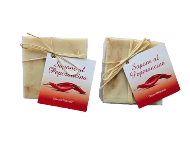 Chili soap, particularly suitable for massaging feet and legs, provides a feeling of lightness and stimulates the skin's natural functions, leaving it soft. Contains: extra virgin olive oil, chili powder, rosemary essential oil. Ingredients: Elaeis guineensis (olive) oil, Olea europaea (olive) oil, Cocos nucifera (coconut) oil, Sodium Hydroxide, Water, Capsicum annuum (capsicum) oil, Rosmarinus officinalis (rosemary) oil, Citral, Limonene, Linalool, Geraniol. Made with extra virgin olive oil, this all-natural product is obtained using cold-press methods and contains no preservatives or antioxidants. Ideal for cleansing the skin without altering its natural pH, it respects the skin's physiological balance. INGREDIENTS Elaeis Guineensis Oil, Olea Europaea Oil, Cocos nucifera Oil, Sodium Hydroxide, Water, Capsicum annuum, Rosmarinus officinalis Oil, Citral, Limonene, Linalool, Geraniol.Particularly suitable for massaging feet and legs, providing a feeling of lightness and stimulating the skin's natural functions, leaving it soft. Ideal for cleansing the skin without altering its natural pH, respecting the skin's physiological balance.Lot 2 x 100 g de savons entièrement naturels au piment calabraise - Ne contient pas de conservateurs ni d'antioxydantsDESCRIPTION DU PRODUIT DESCRIPTION DU PRODUIT Savon au piment particulièrement indiqué pour masser les pieds et les jambes d'une sensation de légèreté et stimule les activités naturelles de la peau et la rend douce. Contient : huile d'olive vierge extra poudre de piment, huile essentielle de romarin. Ingrédients Ingrédients : Elaeis guineensis Oil, Olea Europaea Oil, Cocos nucifera Oil, Sodium Hydroxide, Eau, Capsicum annuum, Rosmarinus officinalis Oil, Citral, Limonene, Linalool, Géraniol. Produit à base d'huile d'olive extra vierge, entièrement naturel obtenu par des méthodes à froid, ne contient pas de conservateurs ni d'antioxydants. Idéal pour nettoyer la peau sans altérer le pH naturel, respecte l'équilibre physiologique de la peau. INGRÉDIENTS Elaeis Guineensis Oil, Olea Europaea Oil, Cocos nucifera Oil, Sodium Hydroxide, Eau, Capsicum annuum, Rosmarinus officinalis Oil, Citral, Limonène, Linalool, Géraniol.Particulièrement indiqué pour masser les pieds et les jambes d'une sensation de légèreté et stimule les activités naturelles de la peau et la rend douce. Idéal pour nettoyer la peau sans altérer le pH naturel, respecte l'équilibre physiologique de la peau.