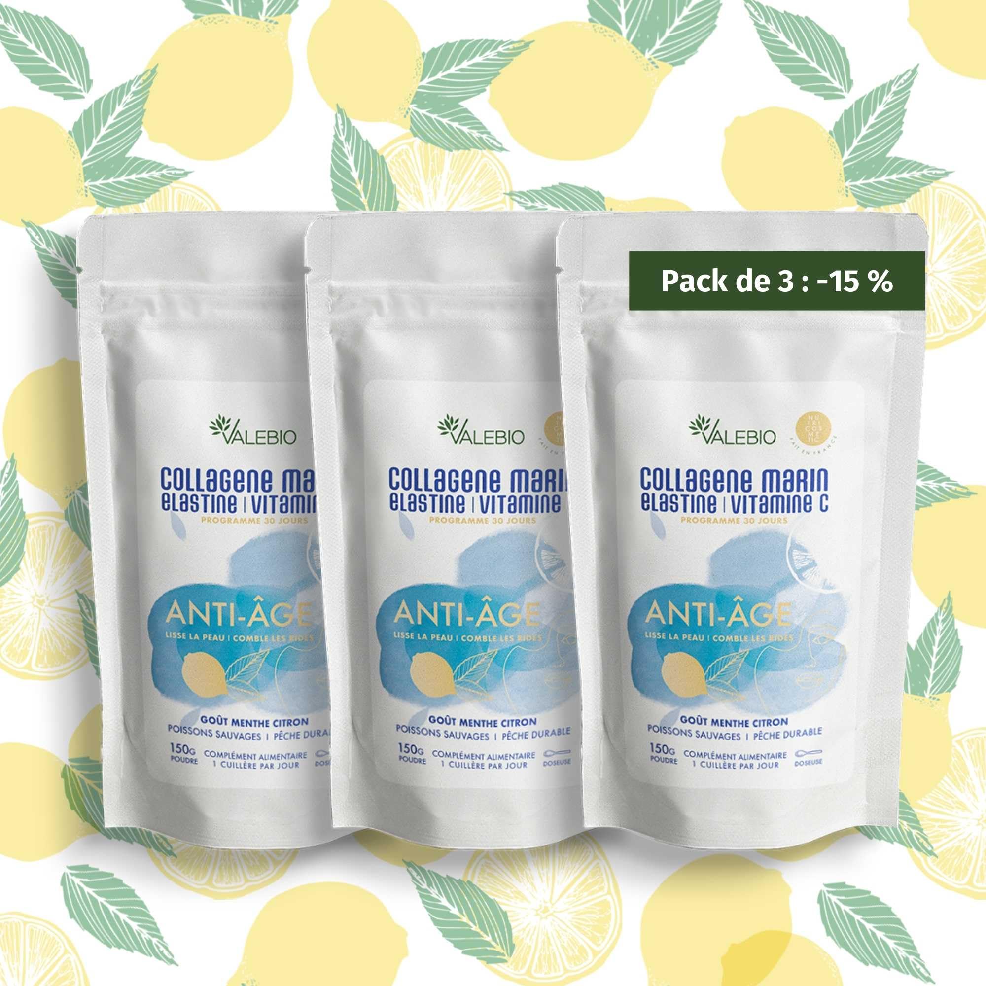 Pack of 3 marine collagen powder mint lemon flavor type 1-3 elastin & vitamin C | anti-aging & anti-wrinkle | 150g | 1 month treatment | Made in France | Valebio