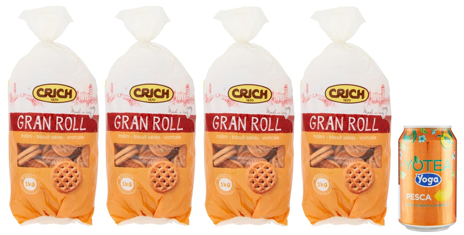 Pack of 4 Crich Gran Roll Shortbread Biscuits Cookies 1kg Bag + 1 Can of Yoga Peach Iced Tea 330ml