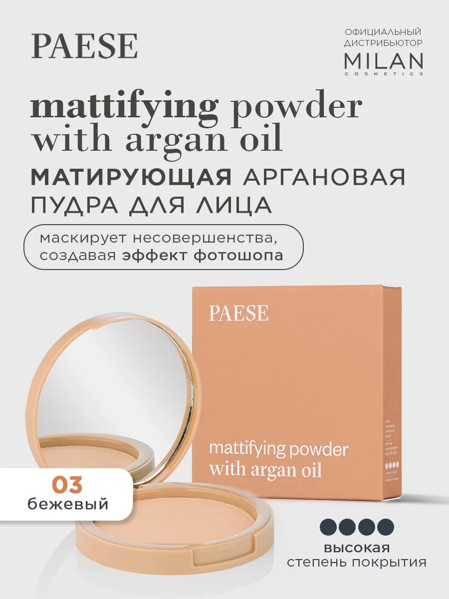 The compact mattifying face powder with argan oil, Mattyfying Powder with Argan Oil, from the Polish professional brand Paese, provides even coverage with a long-lasting matte finish.