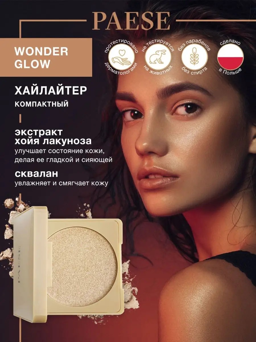 Хайлайтер для макияжа лица Wonder Glow Highlighter Paese это: ультра-гладкая текстура, исключительный уход за кожей, благородное свечение. Имеет шелковистую невесомую ультрагладкую текстуру. Используется для моделирования контуров лица, а также для зоны декольте. Активные ингредиенты: Экстракт растения Hoya Lacunosa (Хойя Лакуноза), увлажняет и улучшает состояние кожи, делая ее более гладкой и сияющей. Содержит сквалан - смягчающее средство, полученное из оливкового масла, является биосовместимым веществом. Увлажняет, смягчает, помогает транспортировать активные вещества в глубокие слои кожи.