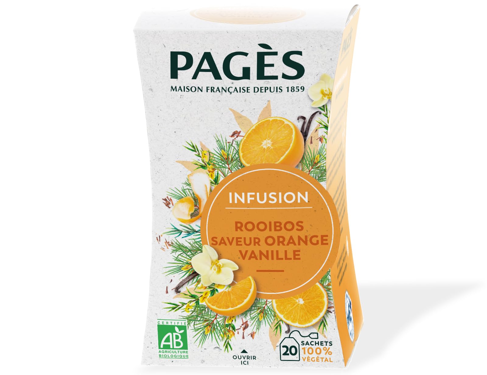 This organic infusion in sachets is a real balancing act, the result of the unique know-how of Maison Pagès in the assembly of plants. Organic vanilla rubs shoulders with the fruity taste of orange. Rooibos envelops everything with its sweetness, naturally without theine. Box of 20 sachets, without metal clips and without glue, made from 100 plant fibers Tasting tips Infusion temperature: 90 C Infusion time: 3 to 5 minutes. Ingredients 100 from organic farming Organic Rooibos 72 , organic Orange peel, natural organic Orange flavor 6 , natural organic Vanilla flavor 4 , organic Cardamom. The good taste of plants since 1859 It is in the heart of Auvergne that Maison Pagès has cultivated the art of blending plants since the 19th century. The oldest infusion brand in France, Pagès offers you the opportunity to savor creations with a natural, intense and sincere taste. INGREDIENTS Organic Rooibos 72 , Organic Orange Peel, Natural Organic Orange Flavor 6 , Natural Organic Vanilla Flavor 4 , Organic Cardamom. DIRECTIONS FOR USE Infusion temperature: 90 C Infusion time: 3 to 5 minutes. THE GOOD TASTE OF PLANTS SINCE 1859: It is in the heart of Auvergne that Maison Pagès has been cultivating the art of blending plants since the 19th century. The oldest infusion brand in France, Pagès invites you to savor creations with a natural, intense and sincere taste. 100 ORGANIC INGREDIENTS: Organic Rooibos 72 , organic Orange peel, organic Orange natural flavoring 6 , organic Vanilla natural flavoring 4 , organic Cardamom. TASTING ADVICE: Infusion temperature: 90 C Infusion time: 3 to 5 minutes. BOX OF 20 100 PLANT-BASED BAGS: With a view to reducing waste, Pagès packaging is eco-designed and cellophane-free. The tea bags are made of paper, without metal staples or glue, and are made from 100 plant fibers. The box is made of recyclable cardboard. ORGANIC ROOIBOS ORANGE VANILLA INFUSION: This organic infusion in tea bags is a real balancing act, the result of Maison Pagès' unique expertise in blending plants. Organic vanilla blends with the fruity taste of orange. Rooibos envelops everything with its sweetness, naturally caffeine-free. Cette infusion BIO en sachets est un véritable tour d'équilibriste, fruit du savoir-faire unique de la Maison Pagès dans l'assemblage des plantes. La vanille bio y côtoie le goût fruité de l'orange. Le rooibos enveloppe le tout grâce à sa douceur, naturellement sans théine. Boite de 20 sachets, sans agrafe métallique et sans colle, composés à 100 de fibres végétales Conseils de dégustation Température d'infusion : 90 C Temps d'infusion : 3 à 5 minutes. Ingrédients 100 issus de l'agriculture biologique Rooibos bio 72 , écorces d'Orange bio, arôme naturel d'Orange bio 6 , arôme naturel de Vanille bio 4 , Cardamome bio. Le bon goût des plantes depuis 1859 C'est au cœur de l'Auvergne que la Maison Pagès cultive l'art de l'assemblage des plantes depuis le XIXe siècle. Plus ancienne marque d'infusions en France, Pagès vous propose de savourer des créations au goût naturel, intense et sincère. INGRÉDIENTS Rooibos bio 72 , Écorces d'Orange bio, Arôme naturel d'Orange bio 6 , Arôme naturel de Vanille bio 4 , Cardamome bio. MODE D'EMPLOI Température d'infusion : 90 C Temps d'infusion : 3 à 5 minutes. LE BON GOUT DES PLANTES DEPUIS 1859 : C'est au cœur de l'Auvergne que la Maison Pagès cultive l'art de l'assemblage des plantes depuis le XIXe siècle. Plus ancienne marque d'infusions en France, Pagès vous propose de savourer des créations au goût naturel, intense et sincère. INGRÉDIENTS 100 ISSUS DE L'AGRICULTURE BIOLOGIQUE : Rooibos bio 72 , écorces d'Orange bio, arôme naturel d'Orange bio 6 , arôme naturel de Vanille bio 4 , Cardamome bio. CONSEILS DE DÉGUSTATION : Température d'infusion : 90 C Temps d'infusion : 3 à 5 minutes. BOITE DE 20 SACHETS 100 VÉGÉTAL : Dans une optique de réduction des déchets, les emballages Pagès sont éco-conçus et sans cellophane. Les sachets sont en papier, sans agrafe métallique et sans colle, et composés à 100 de fibres végétales. La boîte est en carton recyclable. INFUSION BIO ROOIBOS ORANGE VANILLE : Cette infusion BIO en sachets est un véritable tour d'équilibriste, fruit du savoir-faire unique de la Maison Pagès dans l'assemblage des plantes. La vanille bio y côtoie le goût fruité de l'orange. Le rooibos enveloppe le tout grâce à sa douceur, naturellement sans théine.