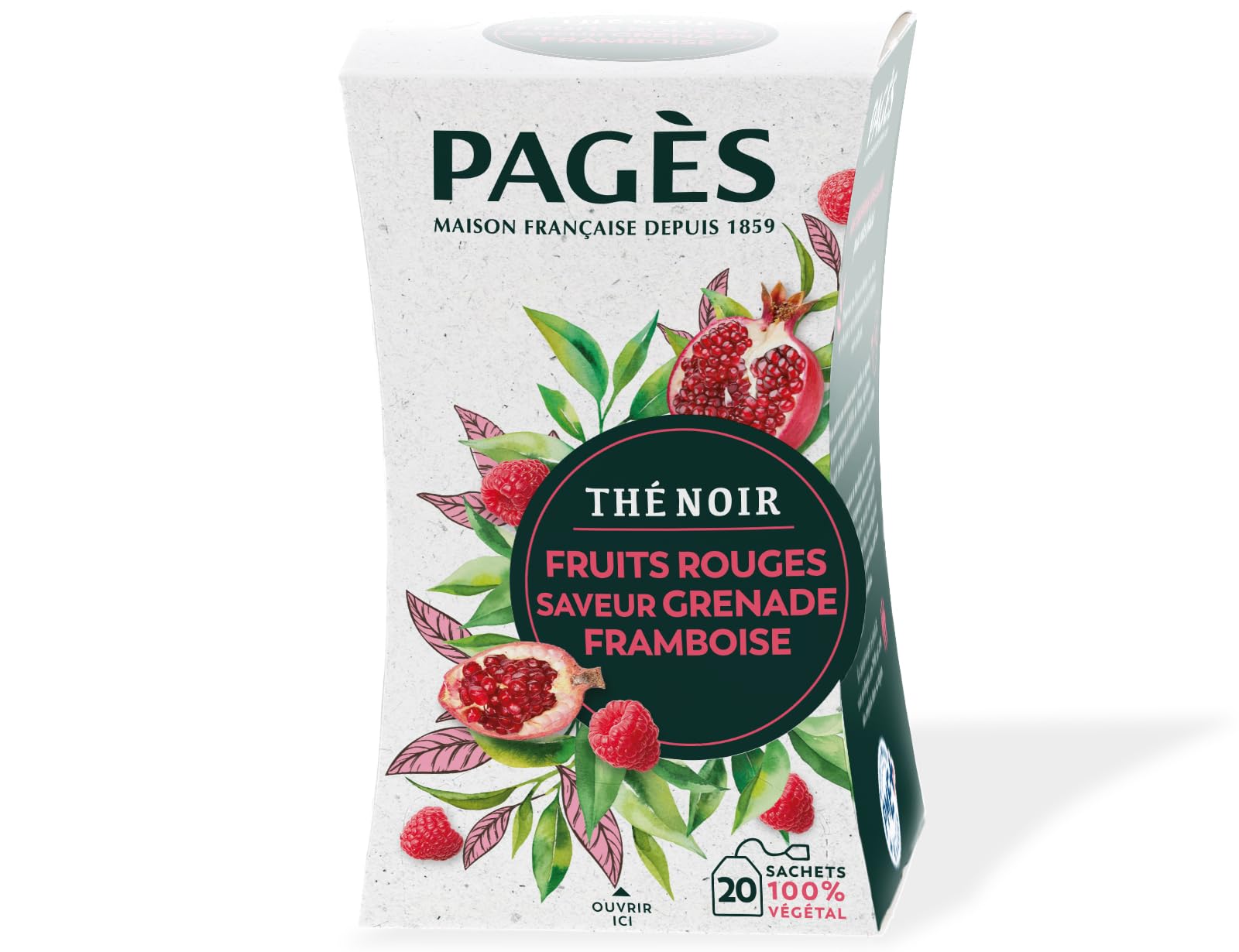 This exceptional black tea, from exceptional gardens, is combined with pomegranate and raspberry. This gourmet blend develops voluptuous and fruity aromas. This black tea is ideal for breakfast, and is also suitable for finishing lunch on a fruity and gourmet note. Box of 20 tea bags, without metal staples and without glue, made from 100 plant fibers Tasting advice Infusion temperature: 90 C Infusion time: 2 to 3 minutes. Ingredients Black tea 84 , Natural flavors 14 , Pomegranate juice, Raspberry. Packaged in Auvergne. The good taste of plants since 1859 It is in the heart of Auvergne that Maison Pagès has been cultivating the art of blending plants since the 19th century. The oldest brand of infusions in France, Pagès invites you to savor creations with a natural, intense and sincere taste. INGREDIENTS Black tea 84 , Natural flavors 14 , Pomegranate juice, Raspberry DIRECTIONS FOR USE Infusion temperature: 90 C Infusion time: 2 to 3 minutes. THE GOOD TASTE OF PLANTS SINCE 1859: In the heart of Auvergne, Maison Pagès has been cultivating the art of blending plants since the 19th century. The oldest infusion brand in France, Pagès invites you to savor creations with a natural, intense, and sincere taste. INGREDIENTS: Black tea 84 , Natural flavors 14 , Pomegranate juice, Raspberry. Packaged in Auvergne. TASTING ADVICE: Infusion temperature: 90 C Infusion time: 2 to 3 minutes. BOX OF 20 100 PLANT-BASED BAGS: With a view to reducing waste, Pagès packaging is eco-designed and cellophane-free. The bags are made of paper, without metal staples or glue, and composed of 100 plant fibers. The box is made of recyclable cardboard. RED FRUIT BLACK TEA: This exceptional black tea, sourced from exceptional gardens, is combined with pomegranate and raspberry. This gourmet blend develops voluptuous and fruity aromas. This black tea is ideal for breakfast, and also works well to finish lunch on a fruity and indulgent note. Ce thé noir d'exception, issu de jardins exceptionnels, est associé à la grenade et à la framboise. Cet assemblage gourmand développe des arômes voluptueux et fruités. Ce thé noir est idéal au petit-déjeuner, et convient également pour terminer le déjeuner de midi sur une note fruitée et gourmande. Boite de 20 sachets, sans agrafe métallique et sans colle, composés à 100 de fibres végétales Conseils de dégustation Température d'infusion : 90 C Temps d'infusion : 2 à 3 minutes. Ingrédients Thé noir 84 , Arômes naturels 14 , Jus de Grenade, Framboise. Conditionné en Auvergne. Le bon goût des plantes depuis 1859 C'est au cœur de l'Auvergne que la Maison Pagès cultive l'art de l'assemblage des plantes depuis le XIXe siècle. Plus ancienne marque d'infusions en France, Pagès vous propose de savourer des créations au goût naturel, intense et sincère. INGRÉDIENTS Thé noir 84 , Arômes naturels 14 , Jus de Grenade, Framboise MODE D'EMPLOI Température d'infusion : 90 C Temps d'infusion : 2 à 3 minutes. LE BON GOUT DES PLANTES DEPUIS 1859 : C'est au cœur de l'Auvergne que la Maison Pagès cultive l'art de l'assemblage des plantes depuis le XIXe siècle. Plus ancienne marque d'infusions en France, Pagès vous propose de savourer des créations au goût naturel, intense et sincère. INGRÉDIENTS : Thé noir 84 , Arômes naturels 14 , Jus de Grenade, Framboise. Conditionné en Auvergne. CONSEILS DE DÉGUSTATION : Température d'infusion : 90 C Temps d'infusion : 2 à 3 minutes. BOITE DE 20 SACHETS 100 VÉGÉTAL : Dans une optique de réduction des déchets, les emballages Pagès sont éco-conçus et sans cellophane. Les sachets sont en papier, sans agrafe métallique et sans colle, et composés à 100 de fibres végétales. La boîte est en carton recyclable. THÉ NOIR FRUITS ROUGES : Ce thé noir d'exception, issu de jardins exceptionnels, est associé à la grenade et à la framboise. Cet assemblage gourmand développe des arômes voluptueux et fruités. Ce thé noir est idéal au petit-déjeuner, et convient également pour terminer le déjeuner de midi sur une note fruitée et gourmande.