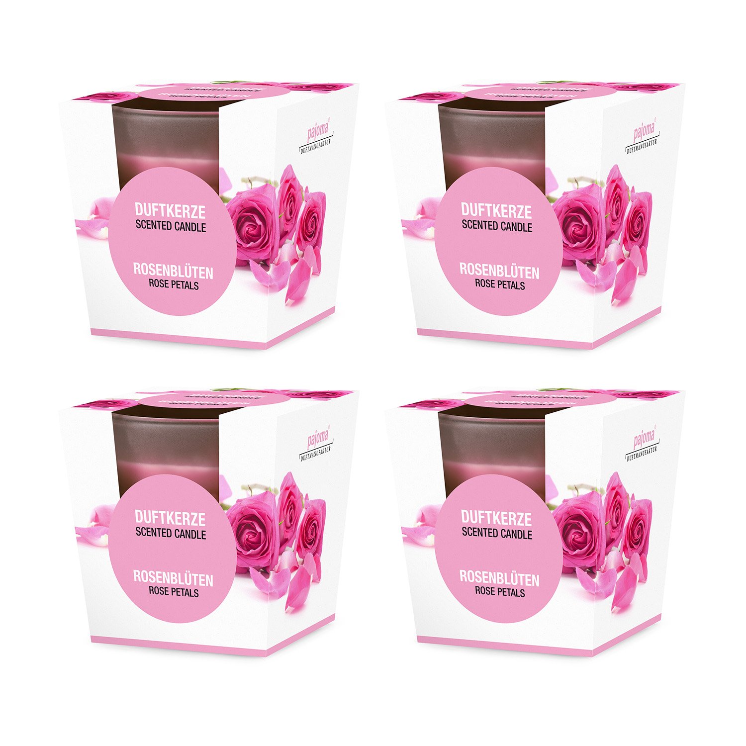pajoma Duftkerze 4er Set, Rosenblüten - im satinierten Glas 4x 120g Wachsgewicht, Brenndauer: 25 Stunden, in edler Geschenkverpackung Premium Qualität Rosenblüten 4