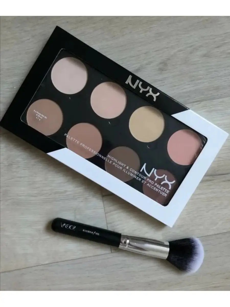 The NYX Highlight & Contour Pro Palette, a large contouring palette, easily corrects and highlights areas of the face, such as the cheekbones, nose, and chin. This professional dry concealer is also used to correct the shape of the face, even out skin tone, and conceal redness and dark circles under the eyes. The concealers can also be used as blush and powder.