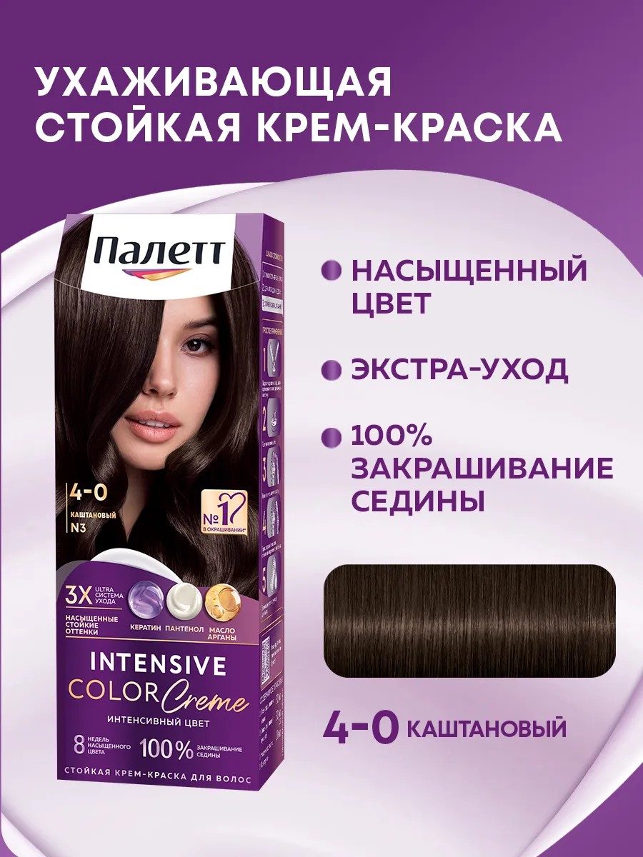 Благодаря тройной системе ухода стойкая крем-краска для волос Палетт обеспечивает бережное окрашивание.