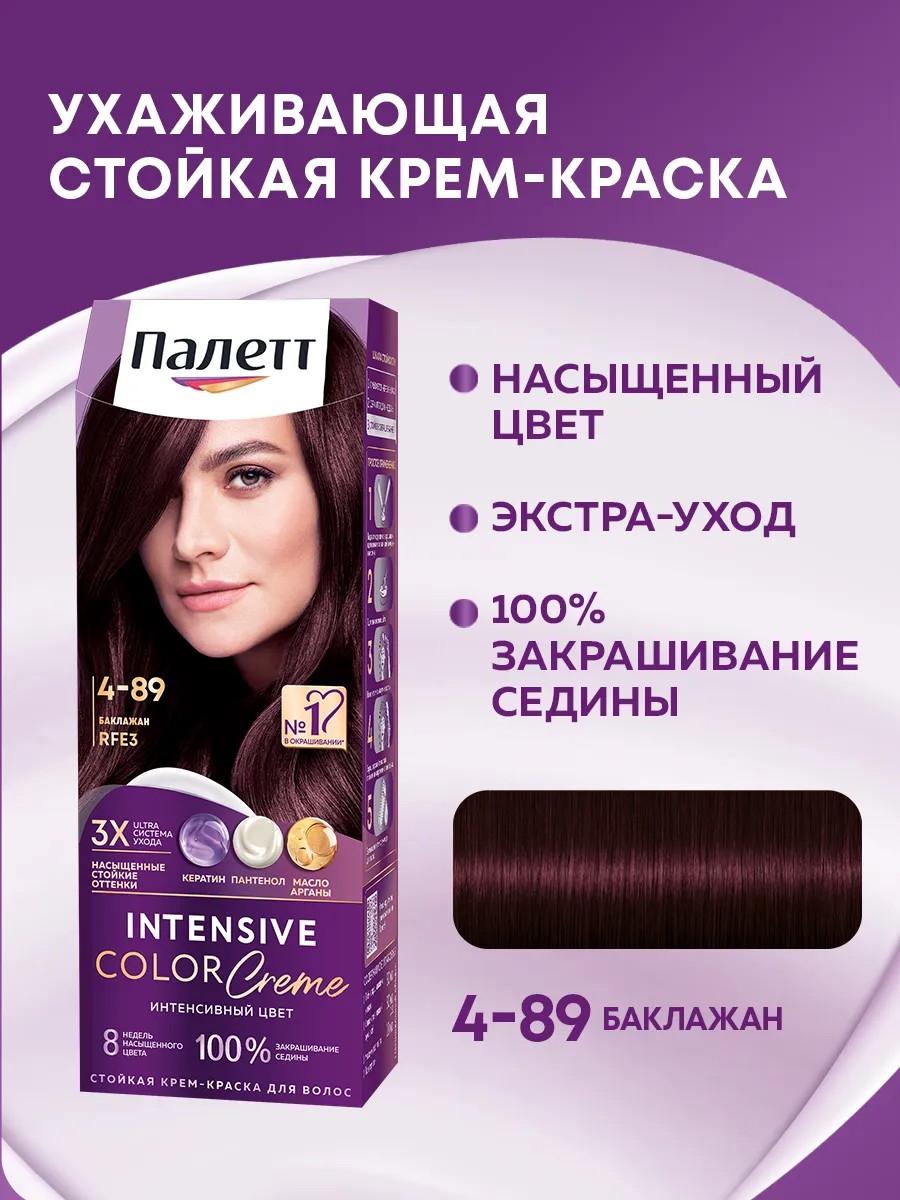Благодаря тройной системе ухода стойкая крем-краска для волос Палетт обеспечивает бережное окрашивание.