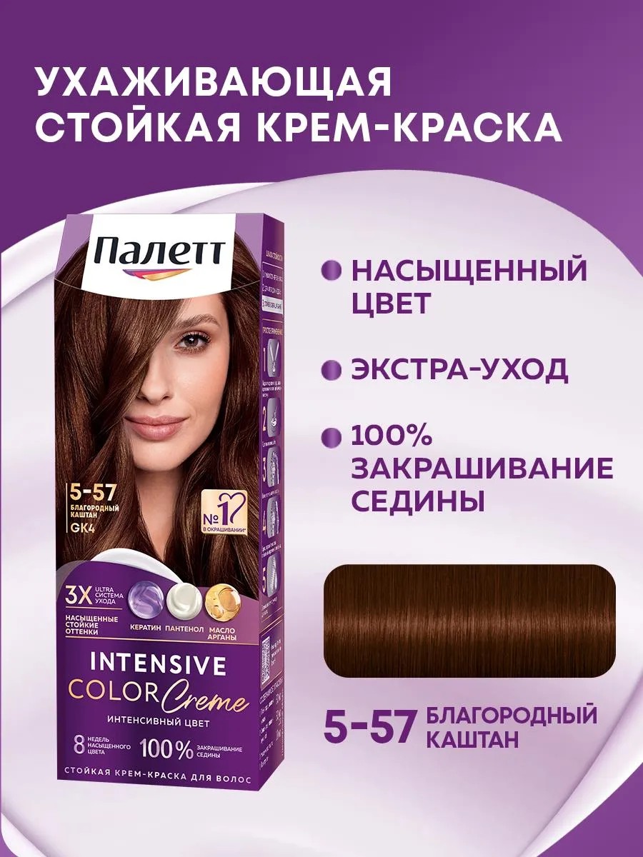 Благодаря тройной системе ухода стойкая крем-краска для волос Палетт обеспечивает бережное окрашивание.