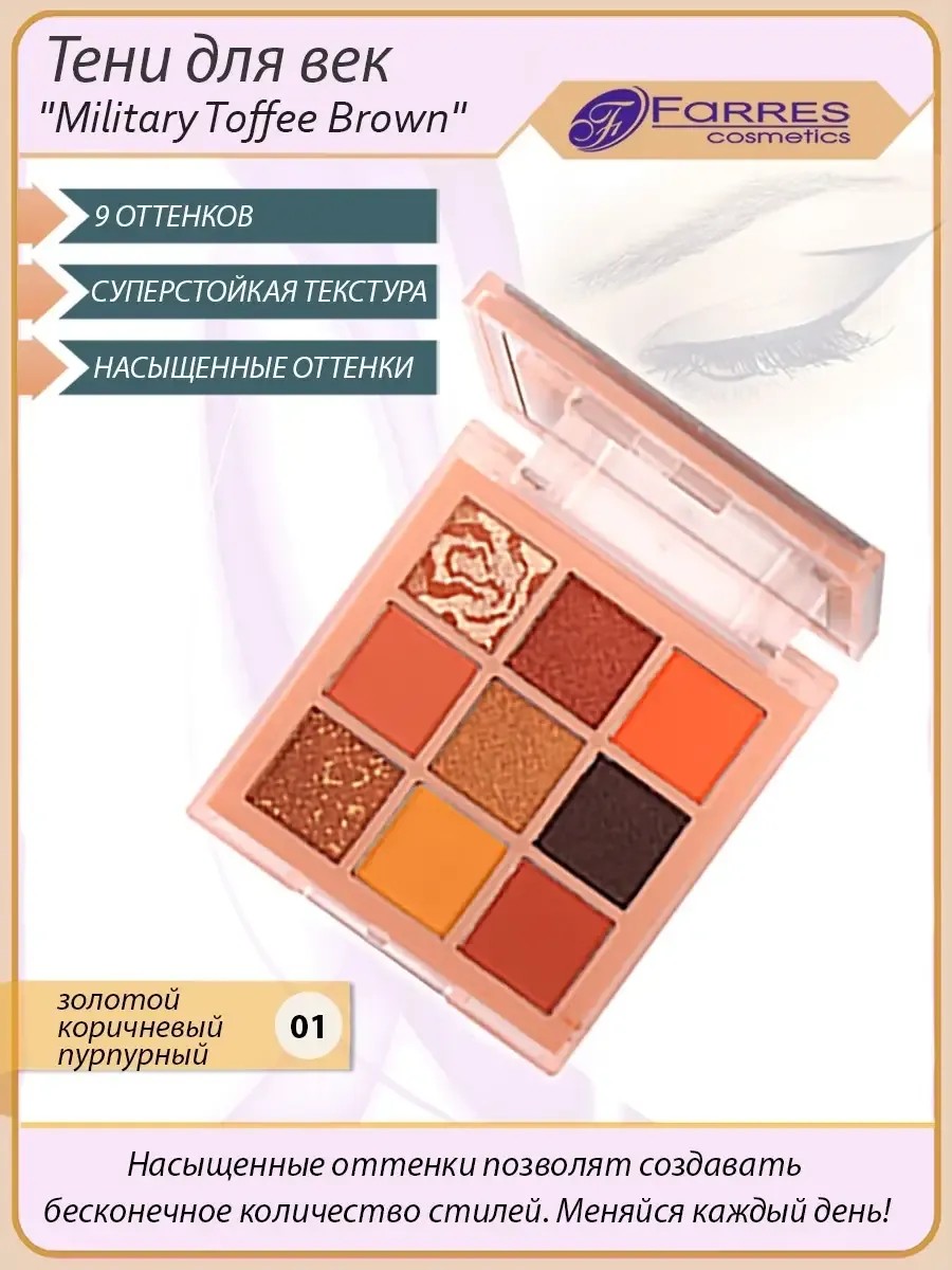 Тени для век от FARRES из девяти завораживающий оттенков - мечта каждой девушки! Суперстойкая текстура палетки теней не осыпается и не размазывается. Насыщенные оттенки теней для глаз позволят создавать бесконечное количество стилей. Меняйся каждый день! Способ применения: нанесите тени с помощью аппликатора или кисточки на веко, для более стойкого эффекта используйте праймер для теней. Самая компактная палетка, гармонично подобранных между собой оттенков теней. Благодаря идеальному сочетанию цветов, можно воплотить самые разные make-up идеи. Пигментированная палетка отличается шелковистой и пудровой текстурой. Для любительниц естественного макияжа - это идеально подобранная палетка нюд. Не нужно думать и гадать, какие оттенки нужно сочетать, так как в палетке все оттенки сочетаются между собой, не создавая грязи. Beauty-продукт легко набирается на кисть и ложится на поверхность век тончайшей вуалью и отлично поддаётся растушёвке. Светлые тени и темные легко наносятся, идеально сочетаются между собой и выглядят аккуратно в течение всего дня. Палетка теней для глаз необходима каждой моднице. Отлично подойдёт в подарок для повседневного использования. В нашем наборе теней для век содержатся как нюдовые оттенки для естественного макияжа, так и яркие цвета, которые помогут создать образ для любого повода. Стойкие тени для век обладают высокой пигментацией, комфортно ложатся, не осыпаются, не скатываются и не въедаются в поры, эта палитра теней идеально подходит для любого типа кожи.