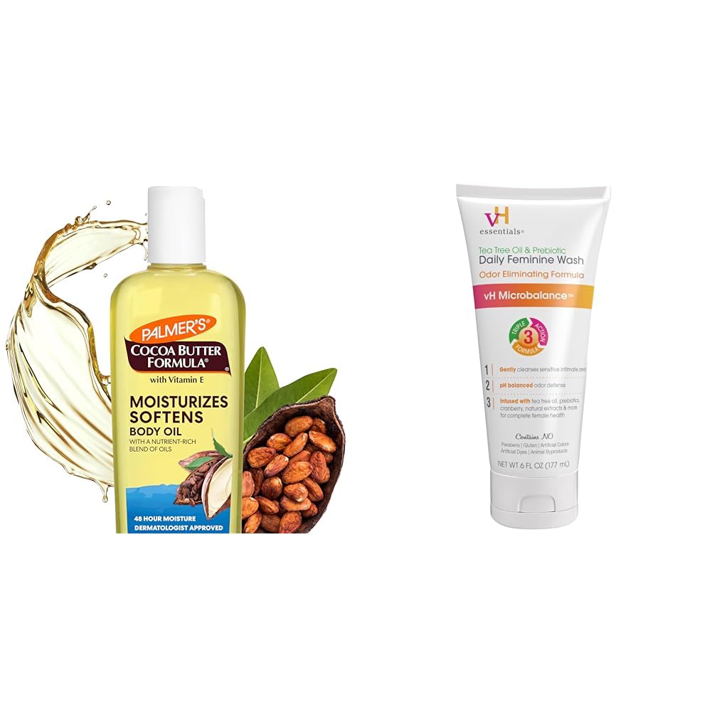 Quality Ingredients: Palmer's uses only the finest natural, raw ingredients like Shea Cocoa Butter and Coconut Oil for soft, hydrated and beautiful skin. Soothing Ingredients: vH essentials intimate wash contains tea tree oil, prebiotics, lavender seed oil and cranberry to help soothe and support feminine care. Long Lasting Moisture: Palmer's fast absorbing, antioxidant rich formula contains natural oils and provides 48 hour moisture for dry skin. Add this lightly scented skin oil to your bath or apply it after your shower. Intimate Wash: vH essentials Tea Tree Oil Prebiotic Daily Feminine Wash offers vH Microbalance Odor Blocking Blend in a tea tree oil cleanser to help fight vaginal odor. Light Moisturizing Oil: Palmer's Cocoa Butter Formula Moisturizing Body Oil is a light oil specially formulated with pure Cocoa Butter and Vitamin E to help soften and soothe rough, dry skin for instant absorption and radiant looking skin.