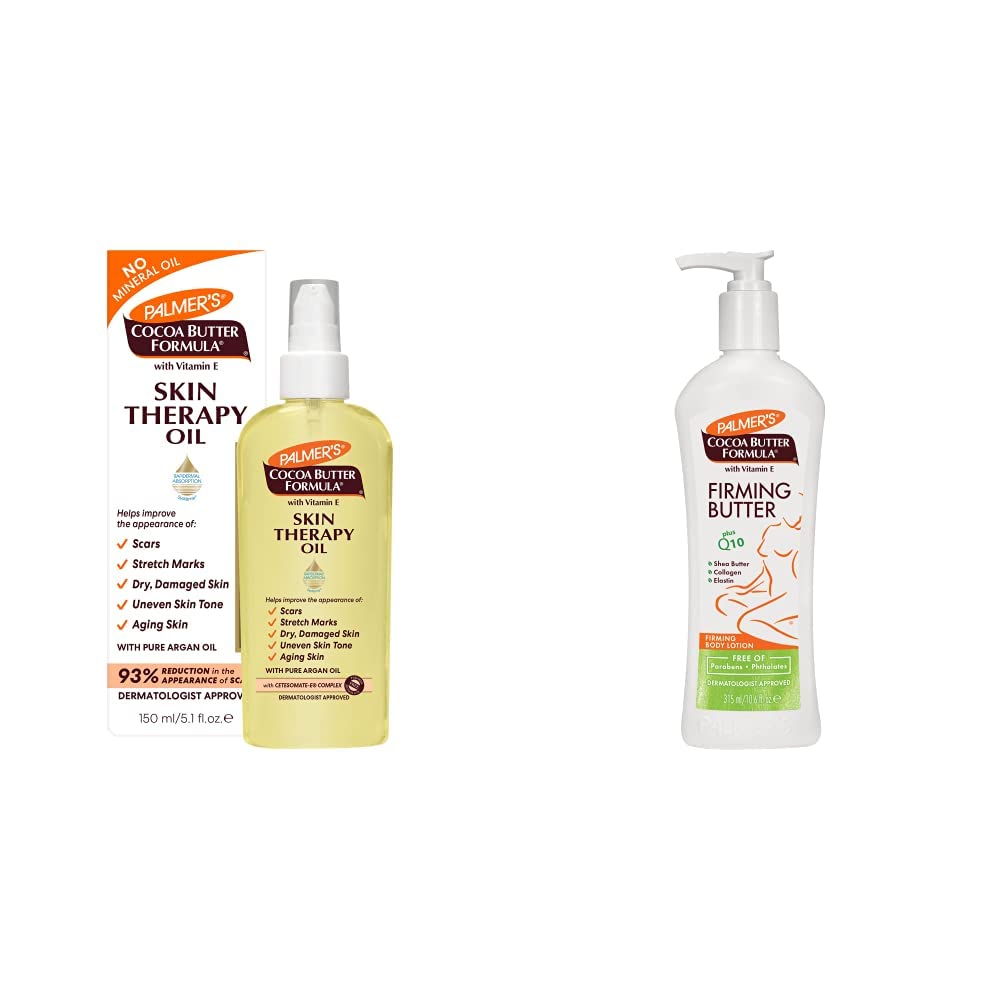 Palmer's Cocoa Butter Formula Skin Therapy Moisturizing Body Oil for Scars Stretch Marks, Deep Body Moisturizer for Dry, Damaged Skin or Uneven Skin Tone, Skincare Oil with Vitamin E, 5.1 Ounces You've heard of using creams and lotions to help your skin stay hydrated or heal dry, damaged skin, but have you considered moisturizing body oils? Some of the best body oils for glowing skin have naturally-derived ingredients, including cocoa butter, coconut oil and argan oil. The Palmer's Skin Therapy Oil collection harnesses all of the cocoa butter benefits and blends it with other skin-loving ingredients to hydrate and pamper your skin. Cocoa butter is a natural emollient that works well for moisturizing skin and aiding with scar lightening, while Vitamin E is rich in antioxidants and helps to heal damaged skin. When blended together they help to minimize scars and keep skin hydrated and healthy-looking. Not only is Skin Therapy Oil one of the best oils for dry skin on the body, it also helps improve the appearance of imperfections. A staple in many women's skin care routines, this advanced multi-purpose dry oil is rich in essential fatty acids, vitamins and antioxidants to perfect skin all-over-the body by improving the appearance of stretch marks, scars and dry, damaged or uneven skin. Try the Palmer's Skin Therapy Body Oil in the original or rosehip fragrance for hydrated, glowing and perfected skin. Palmer's Cocoa Butter Formula with Vitamin E Q10 Firming Butter Body Lotion, Postpartum Essentials Skin Care, Shea Butter, Collagen and Elastin, 10.6 Fl Oz Your body goes through a lot of big changes during pregnancy. Not only do you have strange cravings and stronger nails and hair due to hormones, but your skin stretches to accommodate your growing little one. Don't despair, though - your post-baby body doesn't have to be a bad thing if you can find the best firming body lotion! Embrace your body after giving birth and treat your skin to the soothing, healing power of natural cocoa butter to reduce the appearance of stretch marks and help conquer skin problems after pregnancy. If you find yourself in search of a skin firming and tightening cream, Palmer's Cocoa Butter Firming Skin Lotion offers a natural and effective solution to a post-natal after-pregnancy belly skin tightening regimen. This unique cocoa butter lotion contains a powerful combination of ingredients including vitamin E, collagen, elastin, ginseng, and Co Q10 to help tighten and tone skin and shea butter to deeply moisturize, creating a rich lotion that hydrates your postpartum body and nourishes your skin after pregnancy. It's dermatologist-tested, free of harsh chemicals, and helps to restore elasticity while firming and tightening skin after pregnancy. The formula works to smooth your skin while improving your skin's tone and texture perfect for your post-baby body!Trusted Palmer's brand for over 180 years. Free of harsh chemicals products dermatologist tested. Formulated with cocoa butter to moisturize, shea butter to nourish, and vitamin E to improve scars and marks. Contains a firming body lotion with Q10 and vitamin E to help restore skin, especially after pregnancy or weight loss. Includes a 48-hour moisturizing body oil to help improve the appearance of scars, stretch marks and skin imperfections.