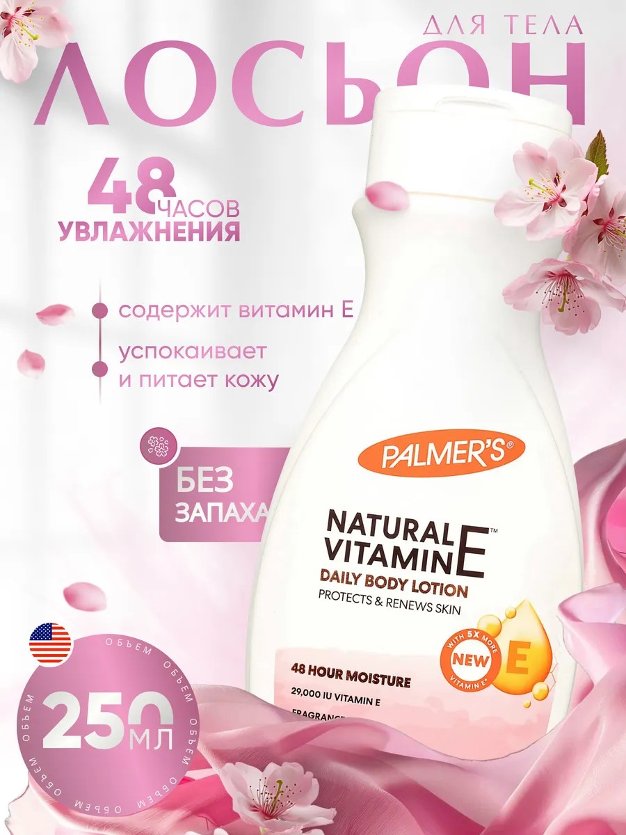 Лосьон для тела питательный Palmer's с витамином Е. Лосьон для тела с экстрактом какао лечит и смягчает огрубевшую и сухую кожу, избавляет от шелушения. Благодаря натуральному составу и высококачественным ингредиентам лосьон отлично сохраняет влагу на протяжении 48 часов. После применения лосьона кожа приобретает подтянутый вид, а также помогает сохранить кожу мягкой и здоровой. Рекомендуется использовать во время беременности и после родов для устранения растяжек. Лосьон подходит для ухода за руками и ногами. Содержит масло миндаля и экстракт какао, которые ускоряют регенерацию кожного покрова и синтез коллагена. Поддерживает обновление клеток и защищает от негативного воздействия внешней среды. Смягчает и увлажняет, восстанавливает и омолаживает, а также обладает высокими антиоксидантными и омолаживающими свойствами. Новогодние товары Палмерс успокаивают кожу и снимают воспаление, восстанавливают эластичность и разглаживают эпидермис. Не содержит ингредиентов животного происхождения - подходит для веганов, а также не содержит парабенов и фталатов. Палмерс протестирован и одобрен дерматологами, подходит коже склонной к экземе и дерматиту. Отлично подойдет на подарок жене и маме, подруге и девушке на новый год. Уходовая косметика — это полезный подарок на день рождения и 8 марта и просто так.