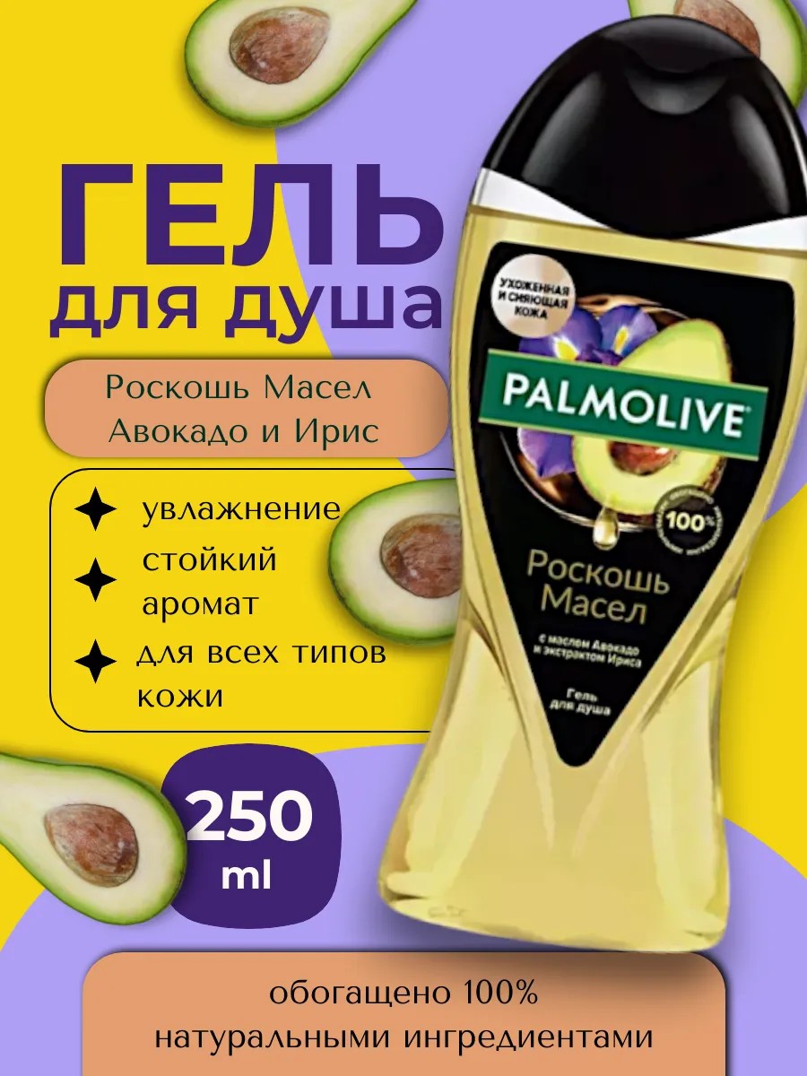 Palmolive гель для душа Роскошь масел с маслом Авокадо и экстрактом Ириса, 250 мл. Парфюмированный гель для тела и купания обладает изысканным цветочным ароматом ириса и восхитительной текстурой роскошных масел, нежно обволакивающих вашу кожу и дарящих ей сияние красоты. Гель для душа женский для ухоженной и сияющей кожи. Преимущества гель для душа Палмолив:
