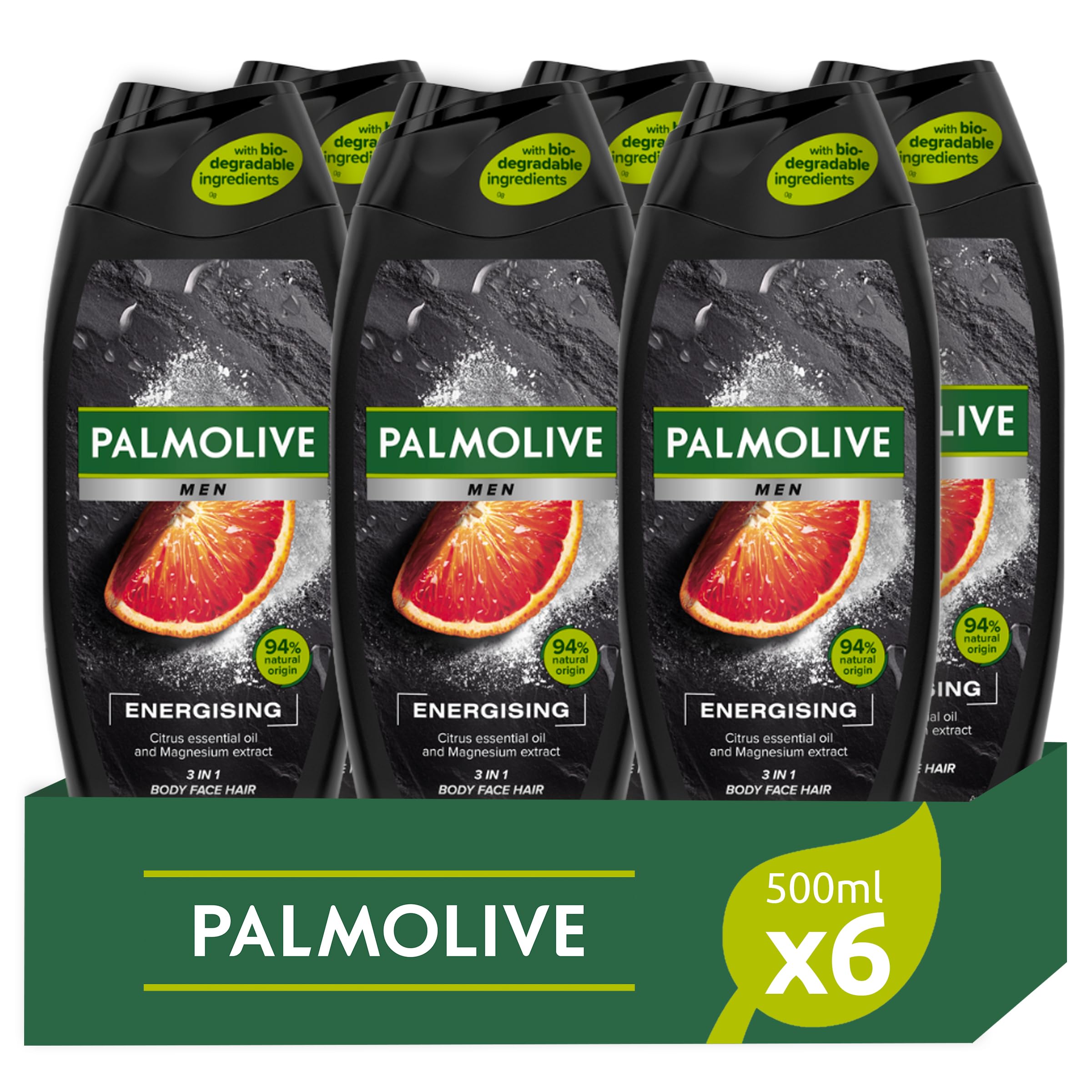 Feel closer to nature and invigorated every time you shower with Palmolive Men 3-in-1 Energizing Body Wash. Our men's body wash is inspired by nature and contains 100 natural essential oils, citrus oil, and magnesium extract for a refreshing shower. Plus, our men's body wash cleanses your body, face, and hair, so you don't have to worry about extra products. This men's body wash has a gentle, dermatologically tested formula with a neutral pH, making it kind to your skin. Because we believe in simplicity, our men's body wash also contains 94 naturally derived ingredients , so you can feel closer to nature while you enjoy an energizing shower. We are committed to nature, sustainability, and responsible sourcing, which is why our Energizing Body Wash for Men has a 95 biodegradable formula that is free of microplastics and comes in a recyclable bottle. Every time you shower with this body wash, you'll not only feel invigorated, but you'll also know you're doing your part for the planet. Naturally Yourself. Water and naturally derived ingredients with limited supply. INGREDIENTS Aqua, Sodium Laureth Sulfate, Sodium Chloride, Cocamidopropyl Betaine, Parfum, Citric Acid, Sodium Benzoate, Coco-Glucoside, Glycol Distearate, Glycerin, Hydrogenated Castor Oil, Magnesium Sulfate, Zinc Citrate, Laureth-4, Trisodium Ethylenediamine Disuccinate, Citrus Aurantium (Lemon) Oil. Dulcis Peel Oil, Citrus Limon Peel Oil, Limonene, Linalool, CI 14720, CI 19140, CI 77231 SAFETY WARNING For external use only. Avoid contact with eyes. See moreOur men's body wash is made with responsibly sourced ingredients and comes in a recyclable bottle. Water and naturally derived ingredients with limited finish. This men's body wash has a gentle formula, is dermatologically tested, and pH neutral. Our men's body wash is made with 94 naturally derived ingredients , has a 95 biodegradable formula free of microplastics, and contains 100 natural essential oils, including eucalyptus oil and sea salt extract. Feel closer to nature and invigorated every time you use Palmolive Men 3-in-1 Energizing Body Wash.Palmolive Homme énergisant 3 en 1 500 ml avec de l'huile essentielle de citro et de l'extrait de magnésium pour le corps, le visage et les cheveuxDESCRIPTION DU PRODUIT DESCRIPTION DU PRODUIT Sentez-vous plus proche de la nature et revigoré chaque fois que vous vous lavez avec le gel douche énergisant 3 en 1 Palmolive Men Notre gel douche pour homme est inspiré de la nature et contient des huiles essentielles 100 naturelles, de l'huile d'agrumes et de l'extrait de magnésium pour une douche rafraîchissante. En outre, notre gel douche pour homme nettoie votre corps, votre visage et vos cheveux afin que vous n'ayez pas à vous soucier de plus de produits. Ce gel douche pour homme a une formule douce qui a été testée dermatologiquement et a un pH neutre, il est donc doux pour votre peau. Comme nous croyons en la simplicité, notre gel douche pour homme contient également des ingrédients à 94 d'origine naturelle , vous pouvez vous sentir plus proche de la nature pendant que vous prenez une douche énergisante. Nous nous engageons à la nature, à la durabilité et à l'approvisionnement responsable, c'est pourquoi notre gel douche énergisante pour homme a une formule biodégradable à 95 qui ne contient pas de microplastiques et possède une bouteille que vous pouvez recycler. Chaque fois que vous prenez une douche avec ce gel douche pour homme, vous vous sentirez non seulement revigoré, mais vous saurez également que vous faites votre part pour la planète. Natiralement vous-même Eau et ingrédients d'origine naturelle avec finition limitée INGRÉDIENTS Aqua, Sodium Laureth Sulfate, Sodium Chloride, Cocamidopropyl Betaine, Parfum, Citric Acid, Sodium benzoate, Coco-Glucoside, Glycol Distearate, Glycerin, Hydrogenated Castor Oil, Magnésium Sulfate, Zinc Citrate, Laureth-4, Trisodium Ethylenediamine Disuccinate, Citrus Auranti. um Dulcis Peel Oil, Citrus Limon Peel Oil, Limonène, Linalool, CI 14720, CI 19140, CI 77231 AVERTISSEMENT DE SÉCURITÉ Usage extérieur uniquement. Évitez tout contact avec les yeux. Voir plusNotre gel douche pour homme est fabriqué avec des ingrédients d'origine responsable et son flacon est recyclable. Eau et ingrédients d'origine naturelle avec une finition limitée. Ce gel douche pour homme a une formule douce, a été testé dermatologiquement et est au pH neutre. Notre bache pour homme est fabriquée à partir d'ingrédients d'origine naturelle à 94 , elle a une formule biodégradable à 95 sans microplastiques et contient des huiles essentielles 100 naturelles, y compris de l'huile essentielle d'eucalyptus et de l'extrait de sel marin. Sentez-vous plus proche de la nature et revigoré chaque fois que vous utilisez le gel douche énergisant Palmolive Men 3-en-1.
