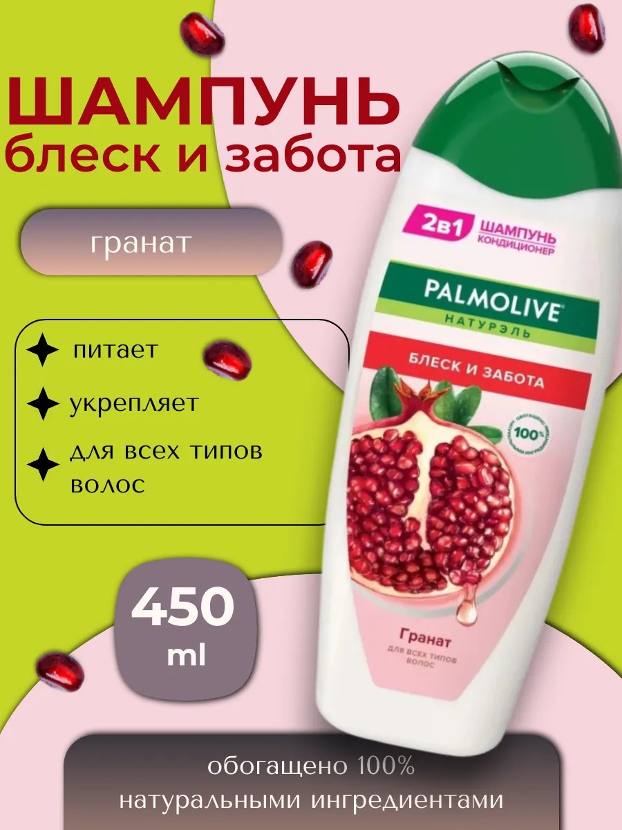 Шампунь Palmolive Натурэль Блеск и Забота с экстр граната, 450 мл. Попробуйте женский шампунь для волос Palmolive Натурэль Блеск и забота с экстрактом граната. Кремовая сияющая формула, обогащенная натуральным экстрактом граната, помогает увлажнить ваши волосы, и Ваши волосы выглядят блестящими и мягкими. Помогает ухаживать за волосами от корней до кончиков. Смягчает волосы и облегчает расчесывание. Естественная красота Ваших волос начинается с Palmolive Натурэль! - Для всех типов волос. - Обогащено 100% натуральными ингредиентами. - Содержит 100% натуральный экстракт граната. - Не содержит парабенов. - Не содержит силиконов. - Не содержит искусственных красителей. - Перерабатываемая упаковка* *этикетка не подлежит переработке