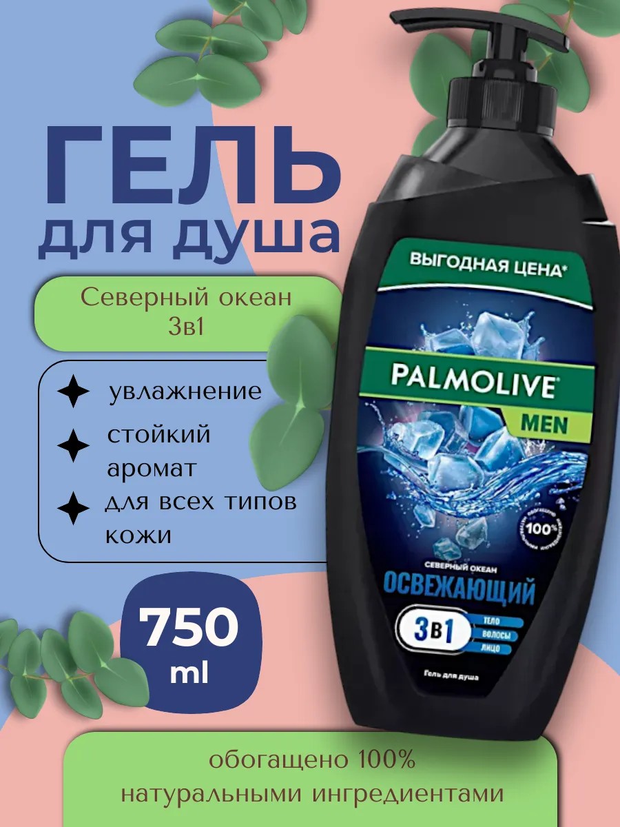 Гель для душа мужской Палмолив MEN Северный океан с морскими минералами является средством 3 в 1: для тела, волос и лица. Формула, разработанная специально для мужчин, способствует поддержанию естественного здоровья кожи и помогает бороться с неприятными запахами, увлажняя кожу и сохраняя ощущение свежести.- Выгодная и перерабатываемая упаковка с дозатором большого объема 750 мл;- На 95% биоразлагаемая формула;- Обогащен 100% натуральными ингредиентами;- Без парабенов и силиконов, а нейтральная PH очищающая формула геля для душа бережно заботится о Вашей коже;- Произведен в Турции, соответствует международным стандартам качества и протестирован дерматологами.Способ применения: нанести на влажную кожу, вспенить и смыть водой. Избегайте контакта с глазами. При попадании в глаза тщательно промыть водой.Гель для душа является отличным подарком на новый год, день рождения, 23 февраля или просто без повода!Palmolive Men — Будь собой. Экономия при покупке упаковки геля для душа Palmolive Men объемом 750 мл по сравнению с покупкой упаковки геля для душа Palmolive Men объемом 250 мл в расчете на 1 мл на основании отпускной цены компании Колгейт-Палмолив.