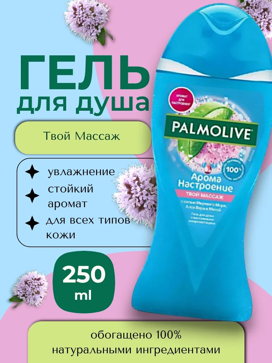 PALMOLIVE "Aroma Mood" shower gel with Dead Sea salt, aloe vera, and mint gently cleanses the skin and relaxes with massage microparticles.