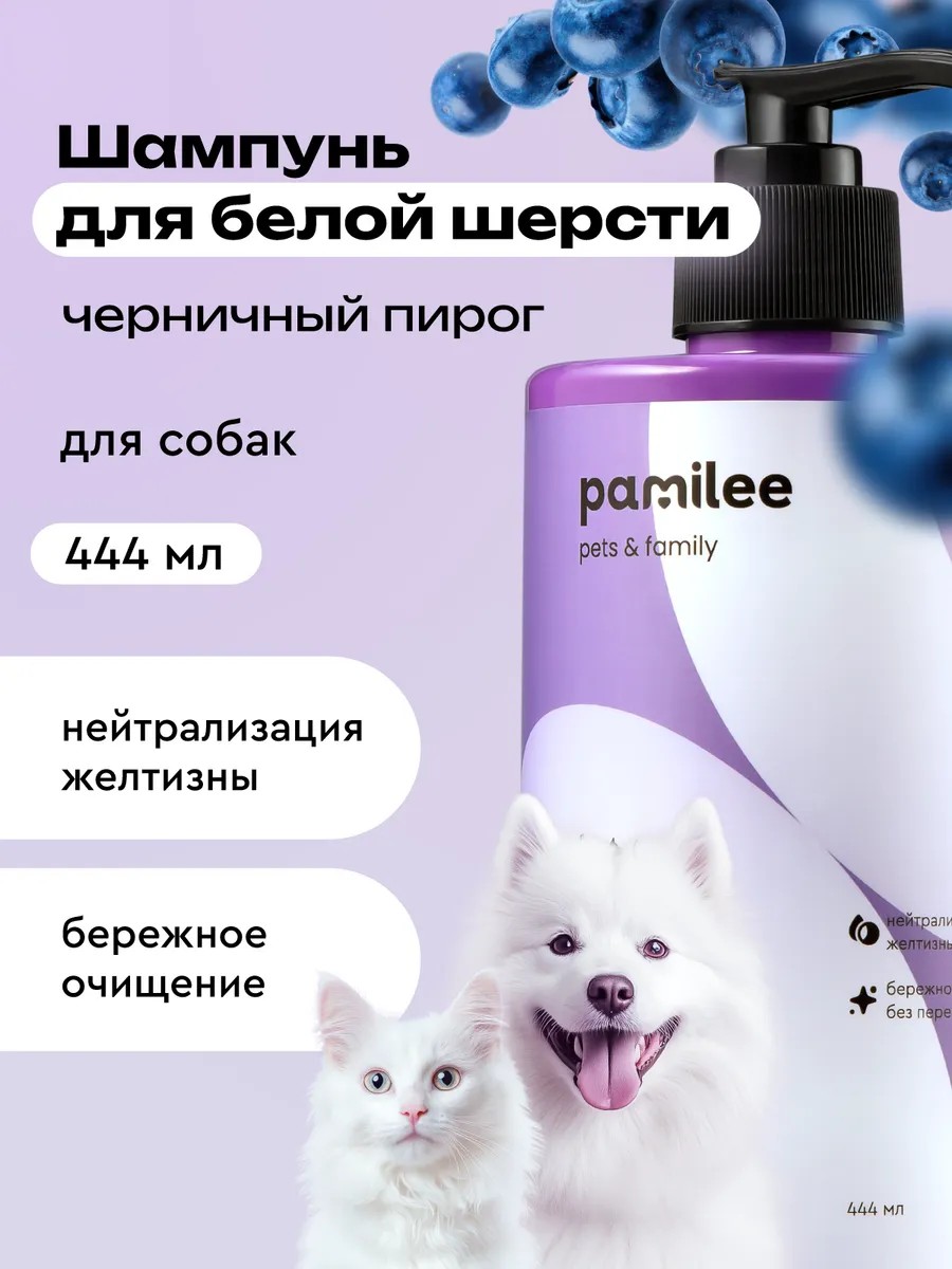 Pamilee shampoo is specially designed for grooming white pets at home, as well as for enhancing the color of black and silver fur.