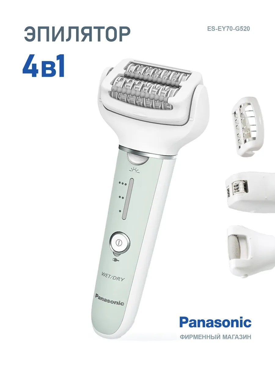 The Panasonic ES-EY70-G520 women's electric epilator for dry and wet hair removal comes in a 6-piece set. It features 4 special attachments for arms and legs, a gentle epilation attachment for sensitive areas, a foot polishing attachment, and a deep cleaning attachment. This electric epilator is suitable for hair removal anywhere on the face and body and is suitable for all skin and hair types. This cordless device features a 30% larger head and a dual disc system with 60 tweezers. The epilator head can rotate up to 90 degrees in all directions, following the contours of the body and leaving incredibly smooth skin. Two discs ensure complete hair removal, with the second disc instantly capturing any hairs missed by the first. The tweezers fit perfectly together, allowing them to grasp and remove even hairs as short as 0.5 mm from the root, which are impossible to remove with wax or a razor blade. It perfectly follows the contours of your body, leaving no missed hairs. LED lighting makes epilating delicate and intimate areas effortless. It epilates hard-to-reach areas with foam, such as underarms and ankles. The device is waterproof and can be used in the bath or shower, and can also be washed completely under running water. Using the epilator in soapy water softens the skin, making hair removal easy and painless. At the touch of a button, you can select from 3 speed settings, tailored to the area being epilated and the thickness of your hair. A full charge of 1 hour provides up to 30 minutes of battery life. This hair removal and shaving machine is ideal for bikini area, legs, and arms. Don't forget to treat your skin after epilation. A storage case and cleaning brush are included. Panasonic home epilators make a great gift for your wife, girlfriend, or friend for a birthday, New Year, or International Women's Day.