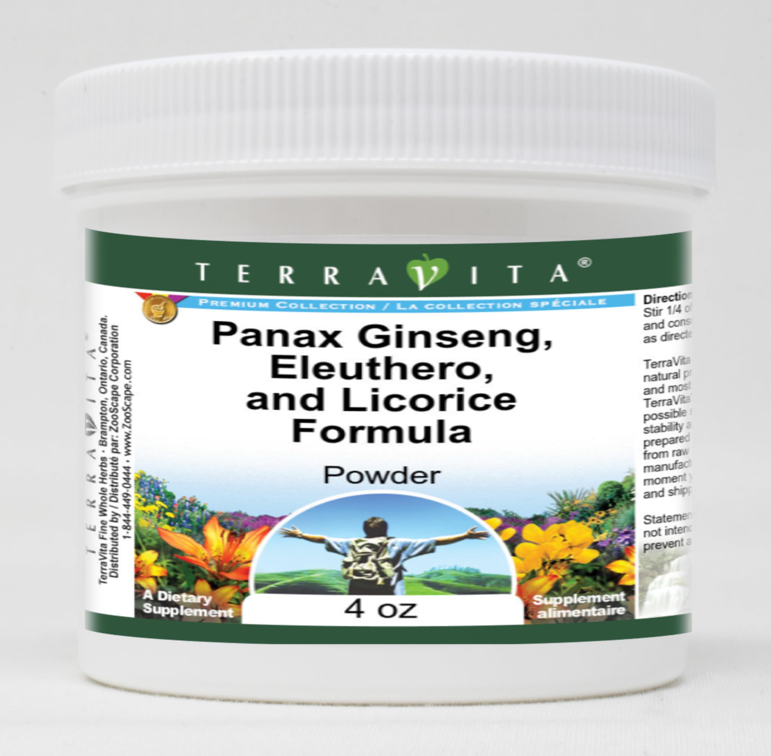 Convenient Powder format. Size: 4 oz. Manufacturer: TerraVita. No fillers. Panax Ginseng, Eleuthero, and Licorice Formula Powder (4 oz, ZIN: 517247).