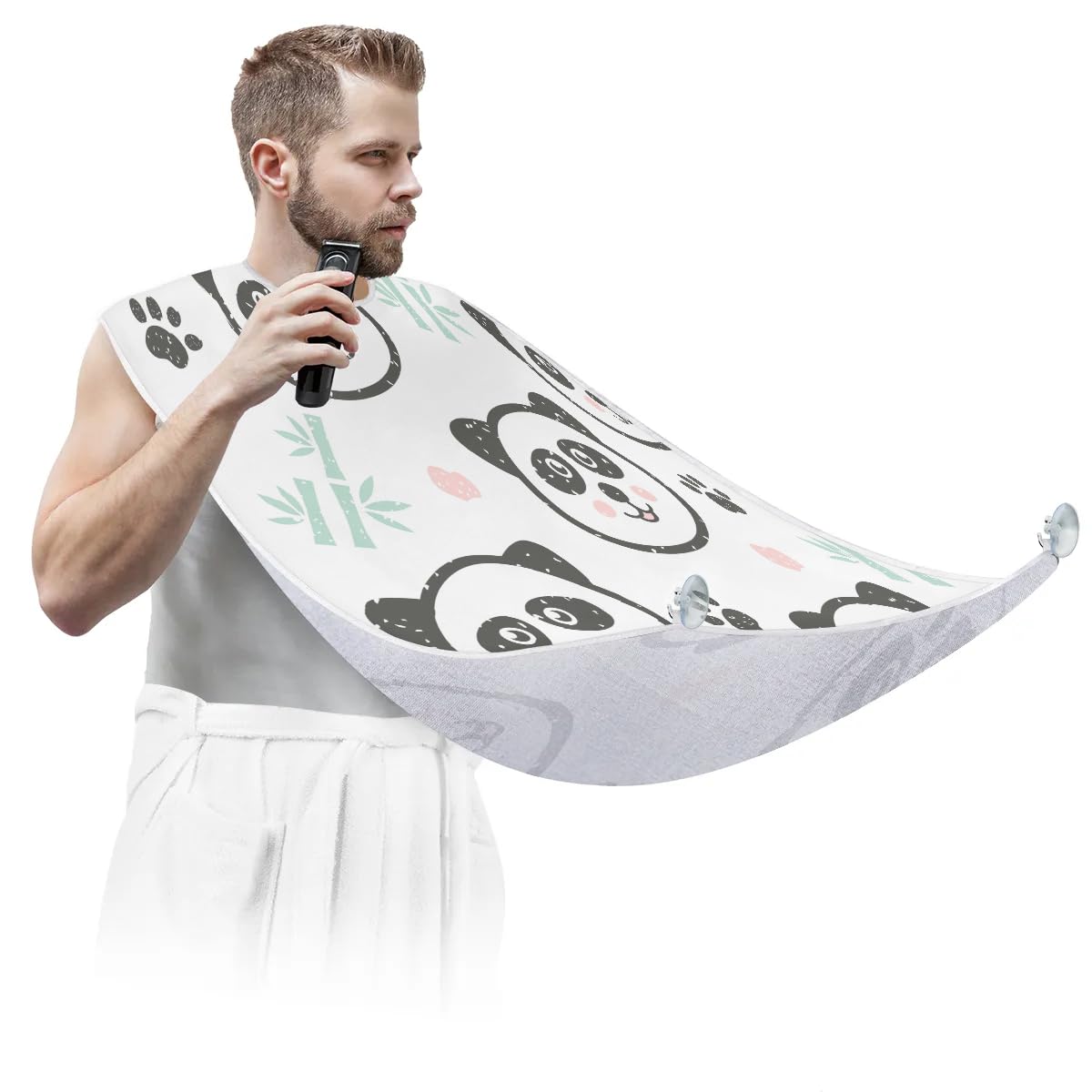 fiber fabric, ensuring exceptional quality. The fabric has a smooth and soft surface that is not sticky to hair, making it comfortable to wear during grooming sessions. It is also waterproof and anti-static, further enhancing its practicality. In addition, it is equipped with two high-quality suction hooks that provide powerful suction without leaving marks on mirrors or tiles. ?Convenient and Easy to Use?: Using our beard hair catcher is a breeze. Just fasten it around your neck using the adjustable strap and secure it to the mirror. Once in place, you can effortlessly proceed with your regular grooming routine. When you're done, simply remove the beard bib from the suction cups. Then brush the collected hair into the trash can for easy cleanup. ?Effortless Hair Cleanup?: Our Panda beard bib is expertly designed to capture all loose beard hair, mustache, and sideburn trimmings, providing effortless cleanup and keeping your sink immaculately clean. This saves you valuable time that would otherwise be spent on tedious cleaning tasks. Not only does it serve a practical function, but it also adds a stylish touch to your daily grooming routine.