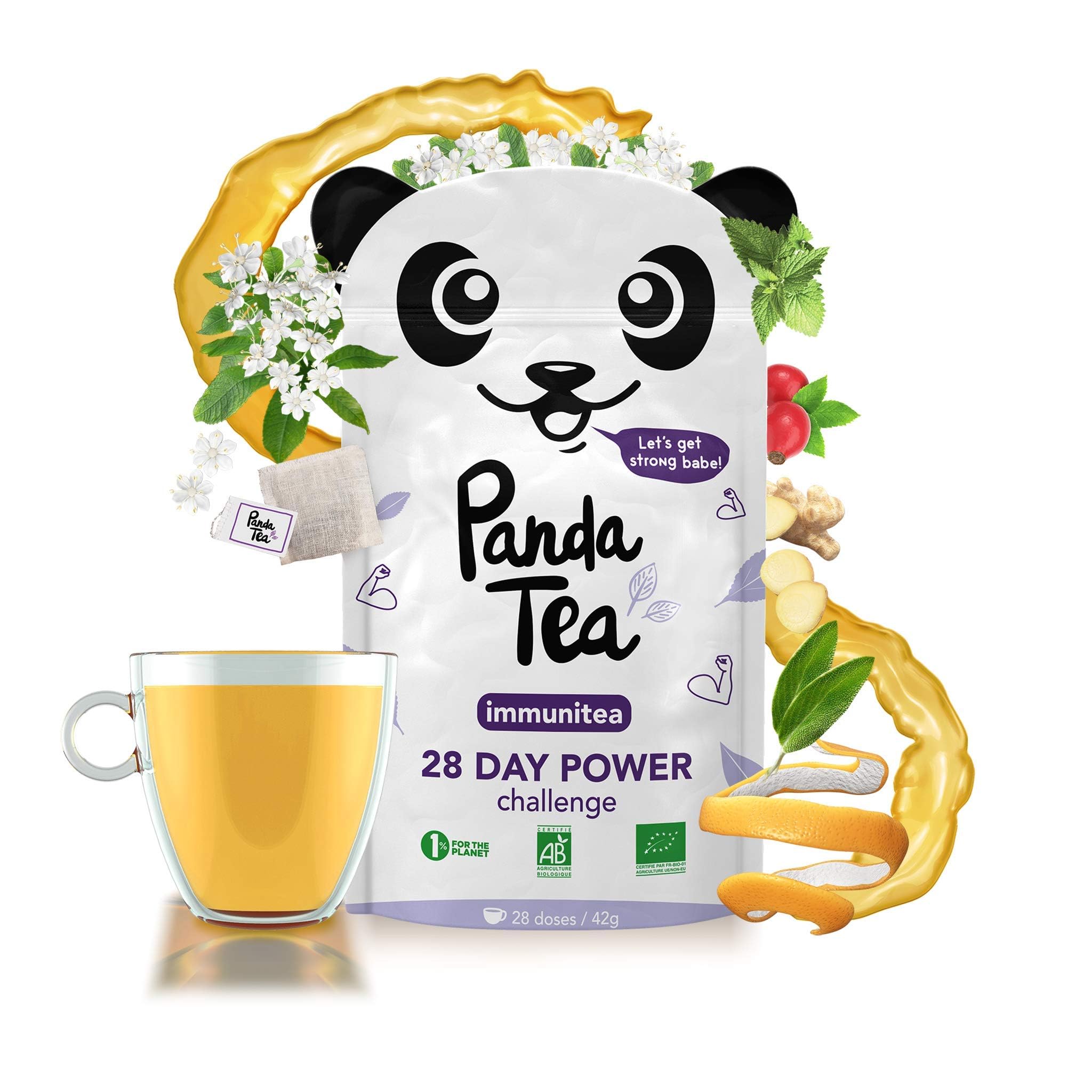 Certified Organic Ingredients: Blend of green tea, ginger, rosehip, peppermint, sage, orange peel, turmeric, eucalyptus, and elderflower. FORMULATED BY A PHARMACIST - specializing in herbal medicine and nutrition, our pharmacist prepares blends to optimize your wellness and weight loss goals. 28 HAND-SEWN COTTON BAGS TEAS - sewn in a French workshop. TEA AND INFUSIONS WITH CERTIFIED ORGANIC EFFECTIVE INGREDIENTS - Green tea - Ginger - Rosehip - Peppermint - Sage leaves - Orange peel - Turmeric root - Eucalyptus - Elderflower - Natural mint flavor. TEA AND INFUSIONS WITH CERTIFIED ORGANIC EFFECTIVE INGREDIENTS - high-quality plants certified by the Ecocert inspection and certification body.Ingrédients Bio Certifiés : Mélange de thé vert, gingembre, cynorhodon, menthe poivrée, sauge, écorce d'orange, curcuma, eucalyptus et fleur de sureau. CONÇU PAR UN PHARMACIEN - spécialisé en phytothérapie et nutrition, notre pharmacien prépare des mélanges pour optimiser vos objectifs bien-être et minceur. 28 SACHETS INFUSETTES EN COTON COUSUS MAIN - cousus dans un atelier français. THÉ ET INFUSIONS AVEC INGRÉDIENTS CERTIFIÉS BIO PERFORMANTS - Thé vert - Gingembre - Cynorhodon - Menthe poivrée - Feuilles de sauge - Écorce d'orange - Racine de curcuma - Eucalyptus - Fleur de sureau - Arôme naturel de menthe. THÉ ET INFUSIONS AVEC INGRÉDIENTS CERTIFIÉS BIO PERFORMANTS - plantes de haute qualité et certifiés par l'organisme de contrôle et certification Écocert.Panda Tea Thé Vert Immunitea 28 Sachets Coton Bio Renforce Défenses Naturelles Gingembre, Menthe Poivrée, Sauge,Eucalyptus Thé Défense Naturelle