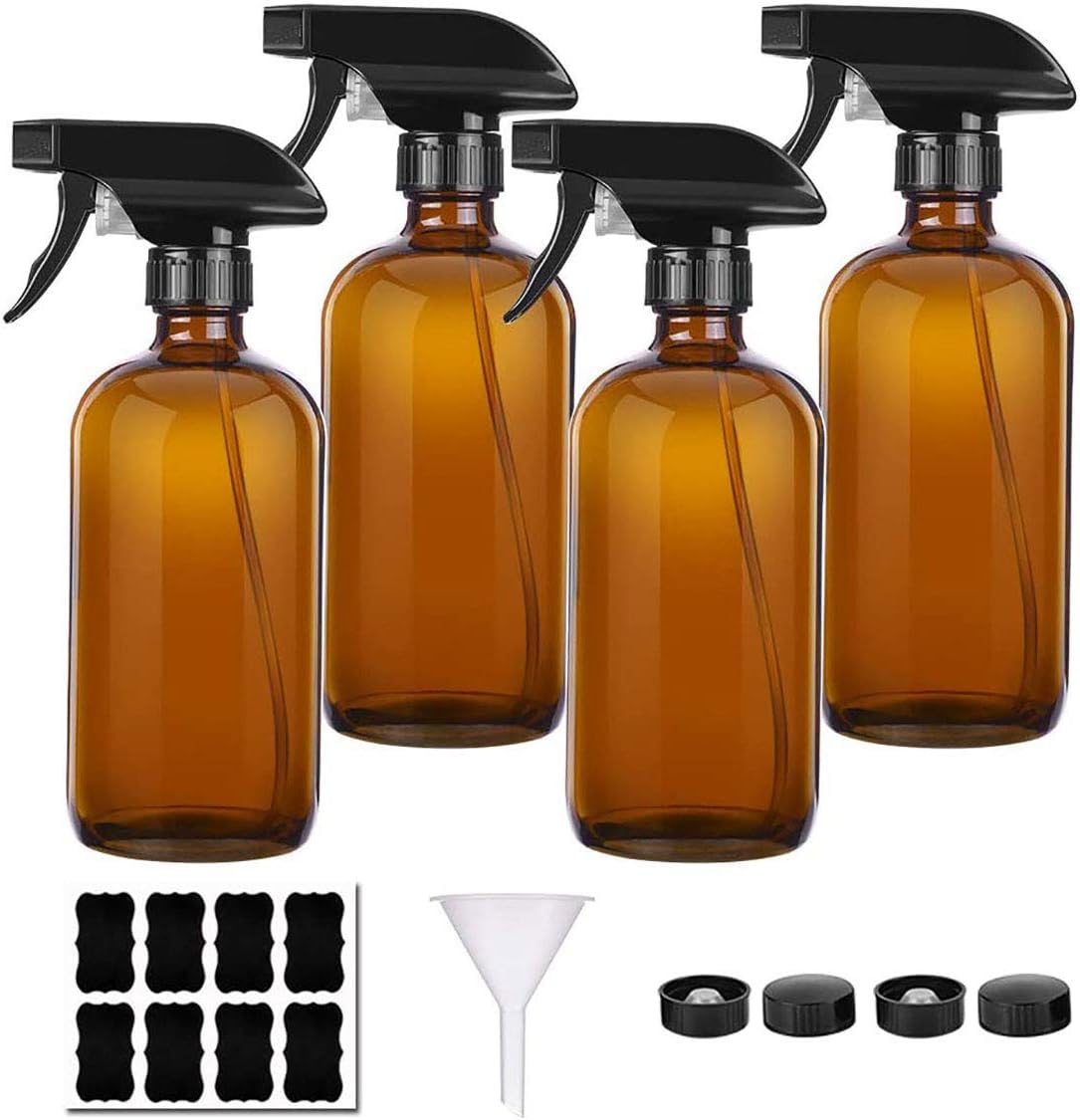 • Perfect bottle set: Contents: 4 x brown bottles, 4 x black trigger sprays, 4 x black flat lids, 1 x funnel, stickers. Do not point the nozzle at your eyes.