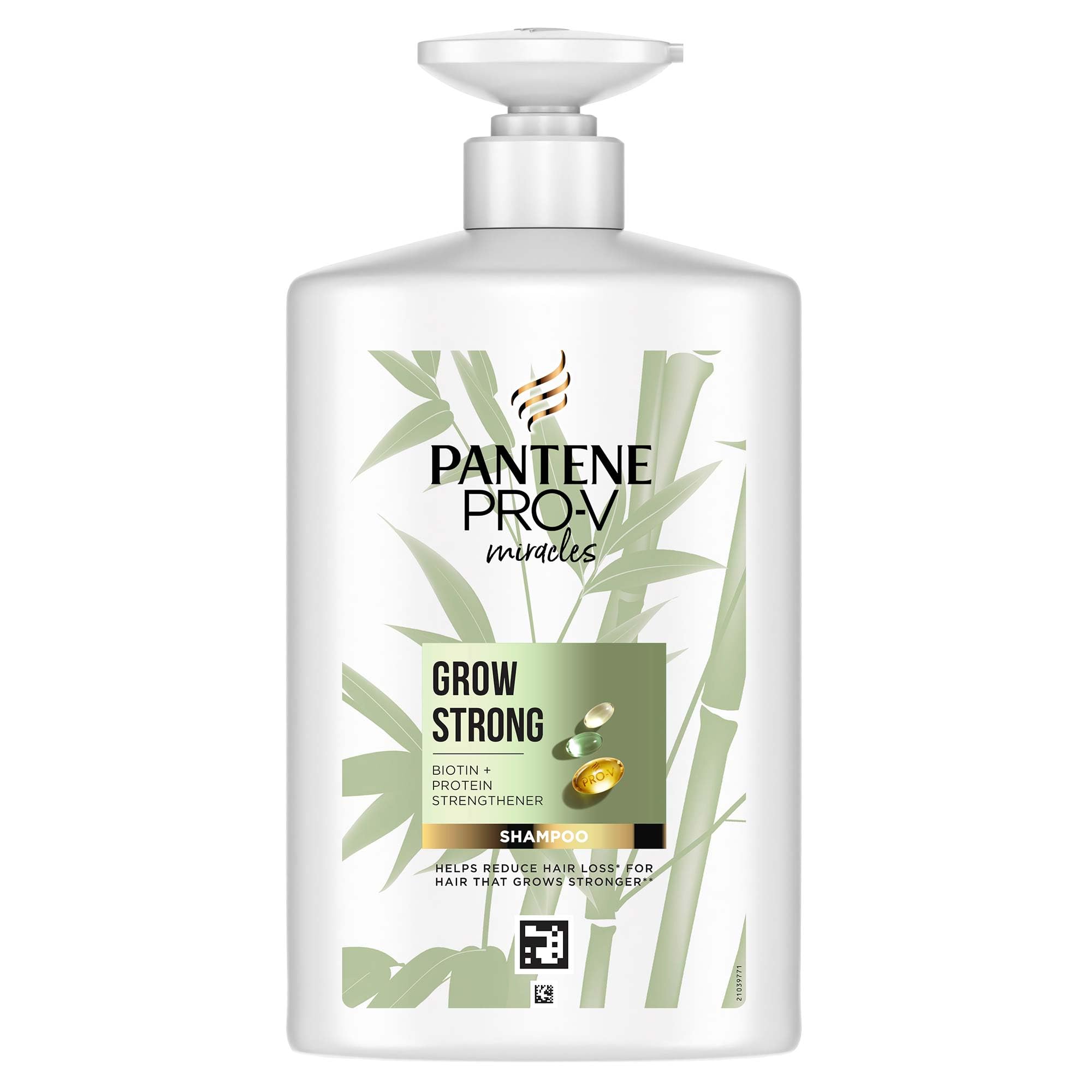 Pantene Pro-V Miracles Grow Strong Shampoo is designed to reduce hair loss due to breakage for strong hair from root to tip (strength against styling damage vs. shampoo without treatment). Enriched with tailored nutrients, our formula combines biotin, strengthening proteins and Pro-V active blends. For dry, damaged hair that is prone to breakage. For best results, use with other hair products in the Miracles Grow Strong range: shampoo, conditioner, leave-in and intensive peel gel for daily use. DIRECTIONS 1. Wet hair. 2. Distribute shampoo through hair. 3. Massage shampoo into lather. 4. Rinse shampoo thoroughly. 5. Repeat if desired.Pump dispenser: With our convenient 1000 ml bottles, you get even more of your favorite shampoo while helping to minimize waste. Simply pull the pump to activate the dispenser and enjoy your product for longer. Step-by-step strength: For best results, combine with other hair products in the Miracles Grow Strong series: shampoo, conditioner, leave-in treatment, and intensive treatment. Strength against styling damage vs. a shampoo without conditioning agents. Expertly developed: Our unique, innovative formula is the result of 75 years of scientific research. Certified by the world-renowned Swiss Vitamin Institute. Tailor-made nutrients and 3 times more PRO-V: The formula is enriched with biotin, strengthening proteins, and our highest concentration of Pro-V, 3 times more than in a Pantene Repair Care shampoo. 100 stronger hair: With this formula, hair can grow long and strong (strength against styling damage vs. a shampoo without conditioning substances). Helps Reduce Hair Loss: Fine, thinning hair? Specially formulated Grow Strong Shampoo reduces hair loss due to breakage, for long, strong hair (strength against styling damage vs. shampoo without conditioning agents). Le shampooing Pantene Pro-V Miracles Grow Strong est conçu pour réduire la perte de cheveux due à la casse pour des cheveux forts de la racine à la pointe (force contre les dommages du coiffage vs un shampooing sans traitement). Enrichie en nutriments sur mesure, notre formule combine la biotine, les protéines fortifiantes et les mélanges actifs Pro-V. Pour cheveux secs, abîmés et sensibles à la casse. Pour de meilleurs résultats, utilisez avec les autres produits capillaires de la gamme Miracles Grow Strong : shampooing, après-shampoing, après-shampoing, sans rinçage et pelegel intensif pour un usage quotidien. MODE D'EMPLOI 1. Mouillez les cheveux. 2. Répartissez le shampooing sur les cheveux. 3. Massez le shampooing pour créer de la mousse. 4. Rincez soigneusement le shampooing. 5. Répétez l'opération si vous le souhaitez.Distributeur de pompe : avec nos bouteilles pratiques de 1000 ml, vous obtenez encore plus de votre shampooing préféré tout en aidant à minimiser les déchets. Il suffit de tirer sur la pompe pour activer le distributeur et profiter de votre produit plus longtemps. Force étape par étape : pour de meilleurs résultats, en combinaison avec les autres produits capillaires de la série Miracles Grow Strong : shampooing, après-shampoing, après-shampoing, soin sans rinçage et soin intensif Force contre les dommages du coiffage vs un shampooing sans agents d'entretien. Développé par des experts : notre formule unique innovante est le résultat de 75 années de recherche scientifique. Certifié par l'Institut suisse de vitamines mondialement reconnu. Nutriments taillés sur mesure et 3 fois plus de PRO-V : la formule est enrichie en biotine, en protéines fortifiantes et notre plus forte concentration de Pro-V, 3 fois plus que dans un shampooing Pantene Repair Care. Des cheveux 100 plus forts : avec cette formule, les cheveux peuvent pousser longtemps et forts (force contre les dommages du coiffage vs un shampooing sans substances de soin). Aide à réduire la perte de cheveux : cheveux fins et amincissants ? Le shampooing Grow Strong spécialement conçu réduit la perte de cheveux due à la casse des cheveux, pour des cheveux longs et forts (force contre les dommages du coiffage vs un shampooing sans agent de soin).
