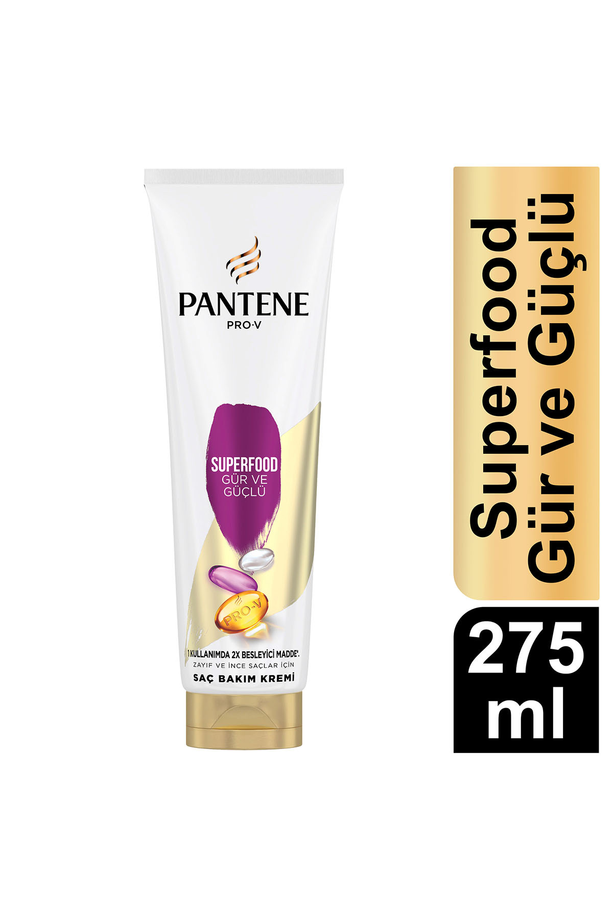 Pantene Pro-V Superfood saç bakim kremi, içten onarim yapmak için köke nüfuz eder. Zayif ve ince saçlar için saç bakim kremi. Pro-V Karisimi: Yipranma belirtilerini aninda tersine çevirir. Antioksidanlar: Kirilmayi önlemeye yardimci olmak için saçi serbest radikallerden korur. Lipidler: Saçin yapisal bütünlügünü korumasina yardimci olmak için takviye saglar. Pro-V karisimi sekillendirmelerden kaynaklanan yipranmaya karsi saçin gücünü geri kazandirmaya yardimci olur. 0 mineral yaglar, 0 renklendiriciler. Swiss Vitamin Institute tarafindan test edilmistir. 30 geri dönüstürülmüs plastikle yapilmis, 100 geri dönüstürülebilir sise (kapak hariç).