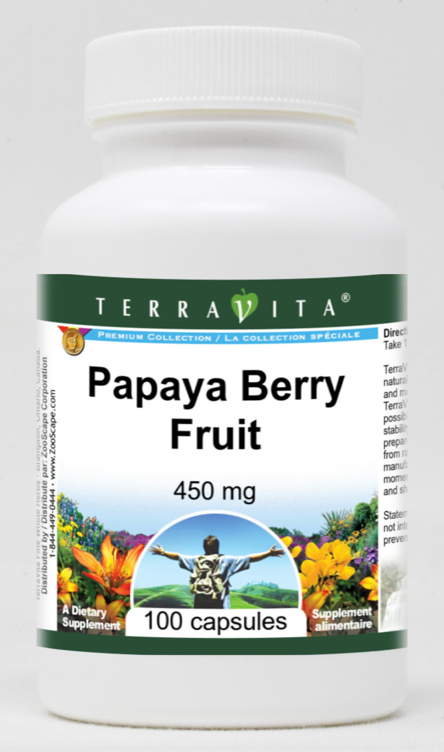 Papaya Berry Fruit - 450 mg (100 capsules, ZIN: 511018) Packaged in the United States in a GMP certified facility (Good Manufacturing Practice). No fillers. Manufacturer: TerraVita Size: 100 capsules Easy-to-swallow Capsules in a sealed bottle. Ingredients: Gelatin, Water, Papaya Berry - 450 mg