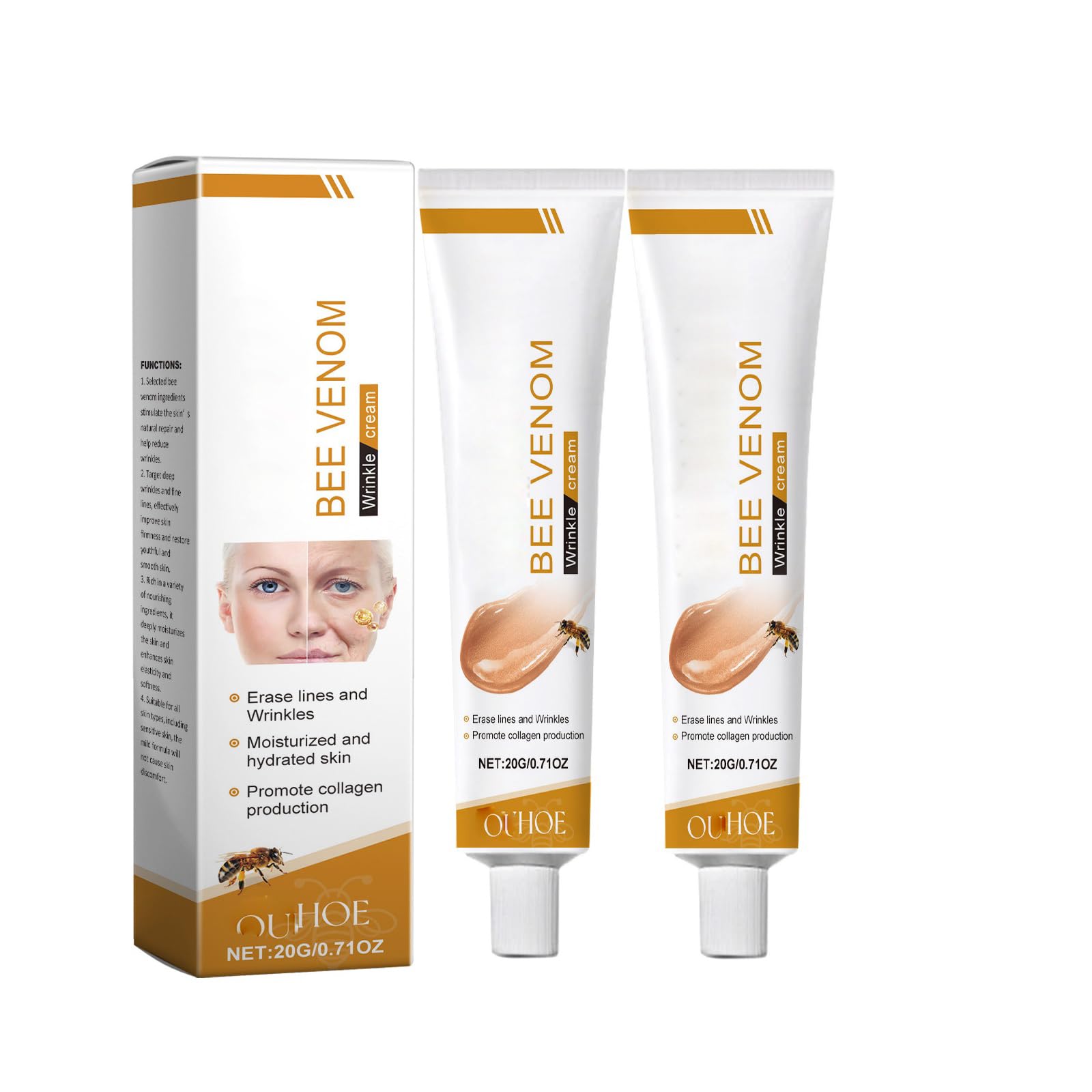 Take an appropriate amount of evenly apply it to the skin.gently massage in circles with until absorbed. Suitable for all skin types,plumps skin, making the skin soft and radiant. Rejuvenate skin,rducing the appearance of fine lines and wrinkles. Natural ingredients,enriched with bee venom vitamin e plus collagen,. Bee venom wrinkle removal cream help tighten and firm the skin, Nourish, hydrate,.
