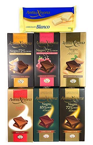 This Antiu Xixona chocolate assortment includes all the varieties from the Premium line. Whether for true chocolate lovers or as the perfect gift, you're sure to make the right choice. It contains one bar of each type: milk chocolate, 72 dark chocolate, 85 dark chocolate, almond chocolate, orange chocolate, blueberry chocolate, and Antiu Xixona white chocolate. Each bar weighs between 100 and 125 grams.[Fruity and Nutty Varieties] Enjoy the excellent blend of dark chocolate and orange, almond, or cranberry. [Soft Chocolates] Includes milk chocolate and white chocolate, perfect for children. [Five Pure Chocolate Varieties] 72 Cocoa Chocolate, 85 Cocoa Chocolate, Pure Almond Chocolate, 72 Cocoa Orange Chocolate, 72 Cocoa Blueberry Chocolate. [Tasting Pack] Perfect as a gift for chocolate lovers you're sure to please. The bars weigh approximately 125 grams. [High Quality] Fine chocolate bars of the highest quality from the Antiu Xixona brand, made in Jijona, the city of sweets.Ce lot de chocolats Antiu Xixona comprend toutes les variétés de la ligne Premium. Pour les vrais amateurs de chocolat ou pour un cadeau parfait, vous êtes sûr de faire le bon choix. Il contient 1 barre de chaque type : chocolat au lait, chocolat pur 72 , chocolat pur 85 , chocolat pur aux amandes, chocolat pur à l'orange, chocolat pur aux myrtilles et chocolat blanc Antiu Xixona. Chaque barre pèse entre 100 et 125 grammes.[Variétés fruitées et noisettées] Appréciez l'excellent mélange de chocolat noir et d'orange, d'amandes ou de canneberges. [Chocolats mous] Comprend du chocolat au lait et aussi du chocolat blanc, parfait pour les enfants. [Cinq variétés de chocolat pur] Chocolat 72 de cacao, Chocolat 85 de cacao, Chocolat pur aux amandes, Chocolat 72 de cacao à l'orange, Chocolat 72 de cacao à la myrtille. [Paquet de dégustation] Parfait comme cadeau pour les amateurs de chocolat, vous êtes sûr de ne pas vous tromper. Les barres ont un poids approximatif de 125 grammes. [Haute qualité] Tablettes de chocolat fin de la meilleure qualité de la marque Antiu Xixona, fabriquées à Jijona, la ville des sucreries.Paquet de 7 tablettes de chocolat Antiu Xixona - Qualité Premium : Chocolat au lait, Chocolat pur et Chocolat blanc