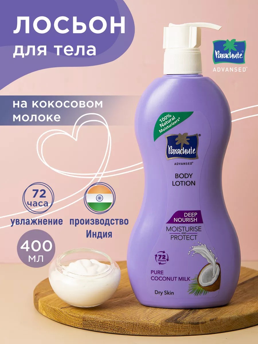 Лосьон для тела с кокосом-отличное средство по уходу за кожей тела. Увлажняет кожу, смягчает ее, придает бархатистость. Лосьон для тела ParachuteAdvancedс кокосовым молокомимеет лёгкую текстуру и быстро впитывается в кожу, делая её мягкой и шелковистой безчувствалипкости.